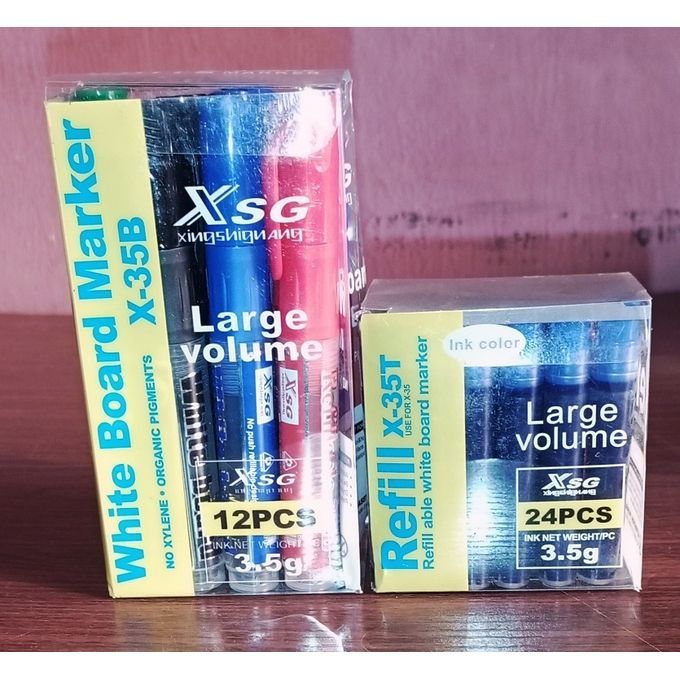 XSG is the best and easy to use refillable and reusable white board marker around now. It is elegant, transparent, and doesn't mess up the user's hand and cloth as it comes with already refilled bottled of the various colours (extra 2 for each color making 24) which you replace when a colour is exhausted and can be bought separate at any time.