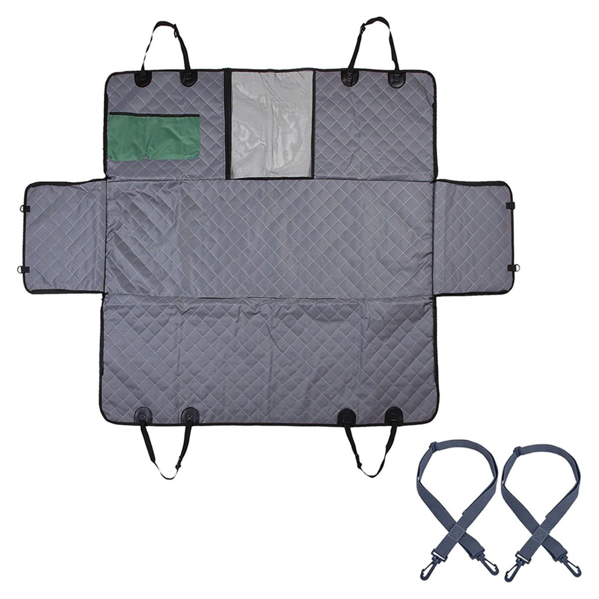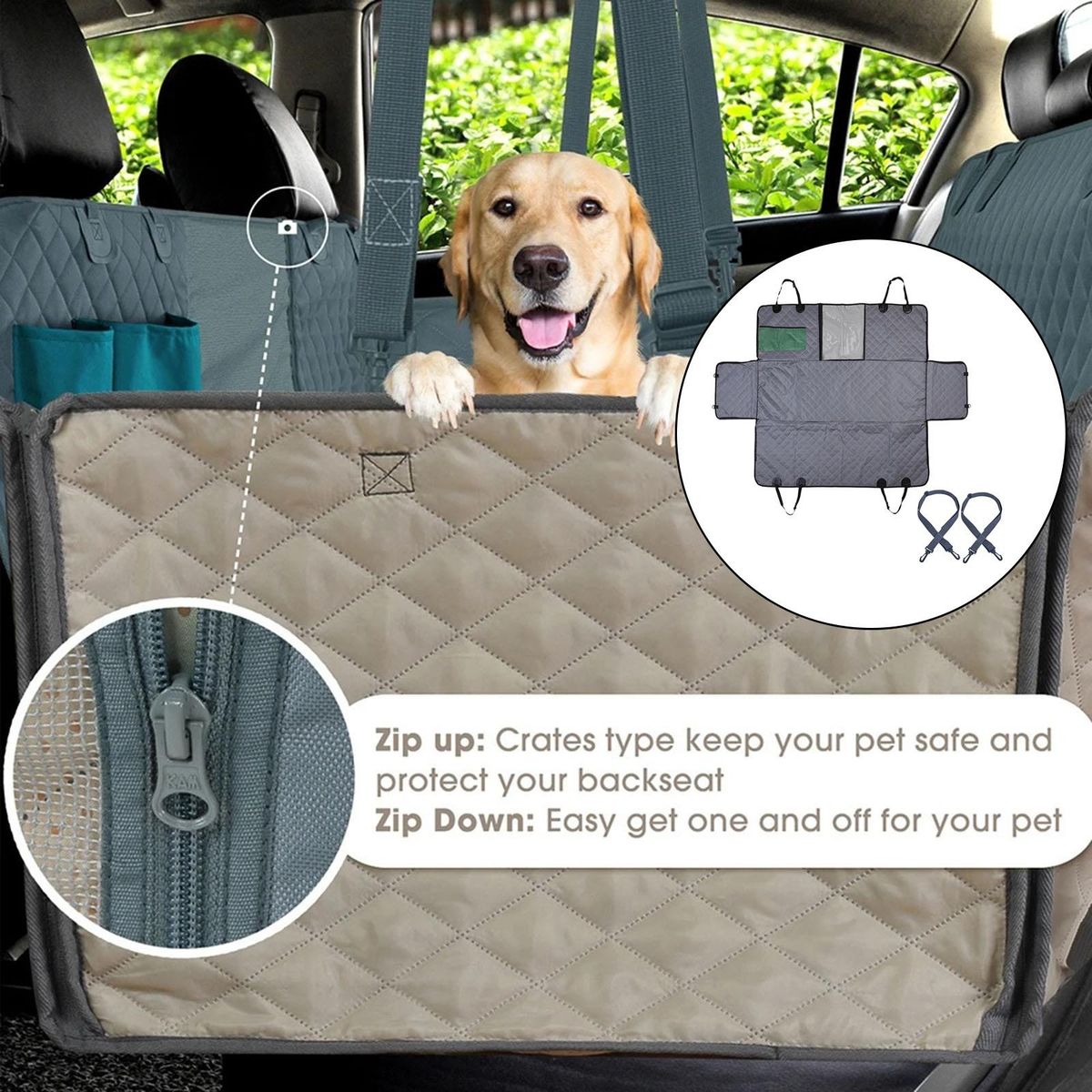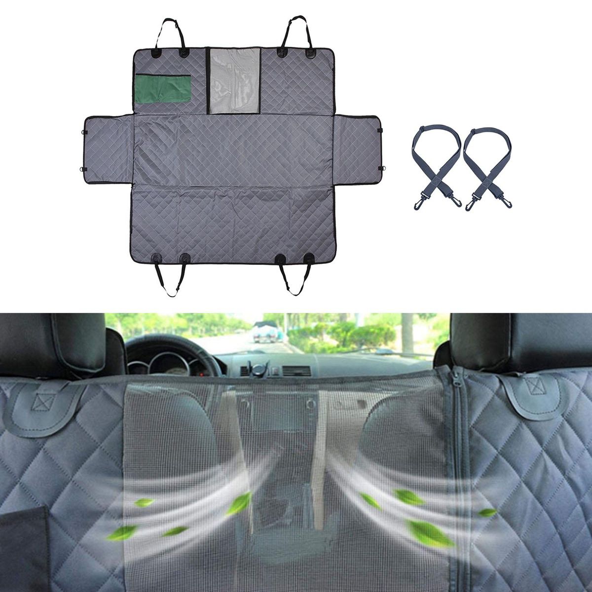 Dog Back Rear Seat Cover: keeps your car rear seat from any , dirt, hair, and moreWaterproof: Car Rear Back Seat Protector Mat made of oxford cloth material,water resistant cloth coating,very durable, and easy to clean and wipeMultifunctional: Dog Car Seat Cover suitable for most of cars, trucks and SUVs protects your entire backseat from scratchesEasy to Install: Adjustable straps with hooks for easy installation and most comfortable fitConvenient Design: Zipper side flaps to closure for your pets to get in or out easily and safely.Premium Mesh Visual Window, Better Air Circulation