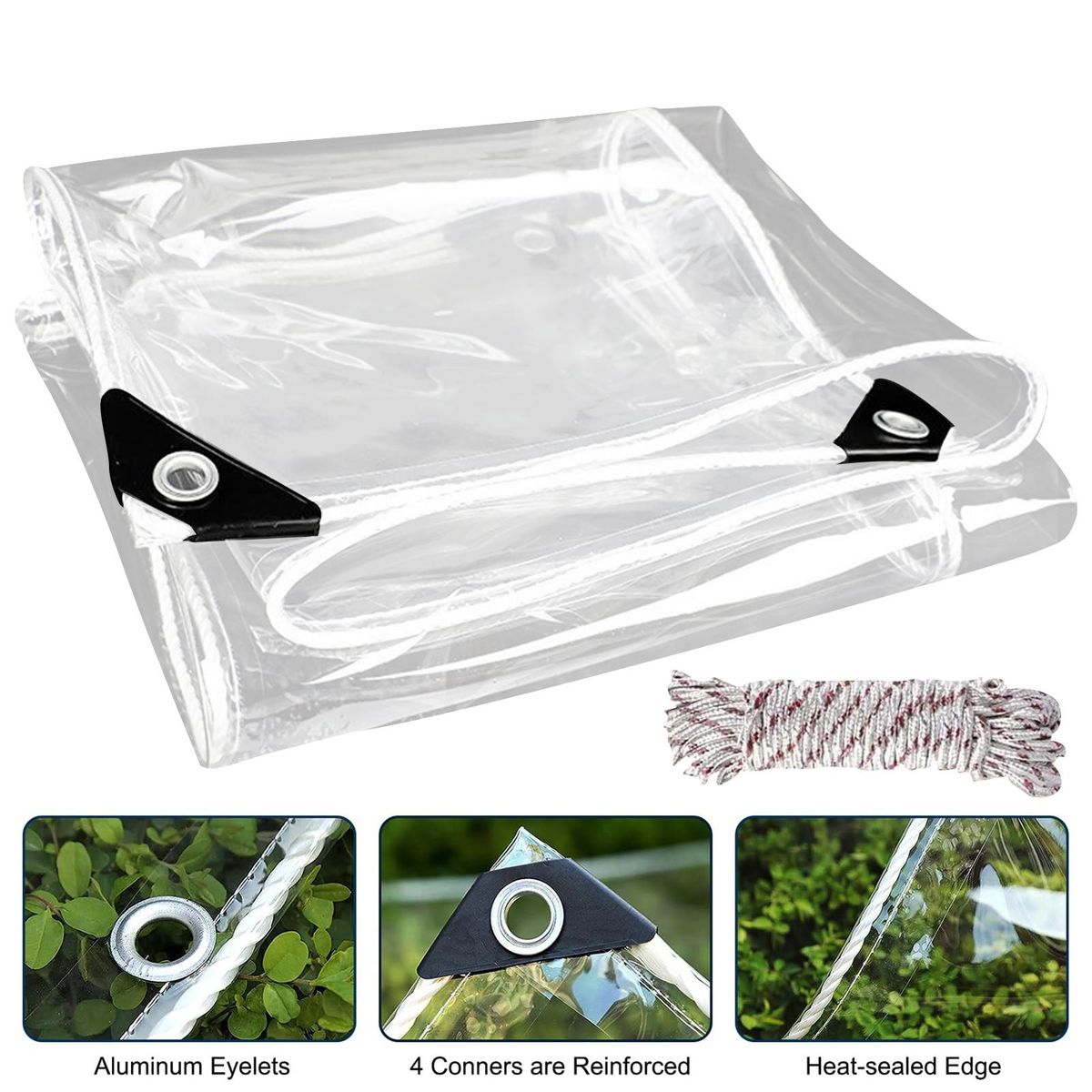 Designed with durability in mind, our clear tarp is heat sealed and folded on all four sides, preventing tearing and deformation. the polyethylene rope sewn from end to end adds extra support, ensuring long-lasting use. the reinforced corners with plastic panels and aluminum eyelets further enhance its strength.