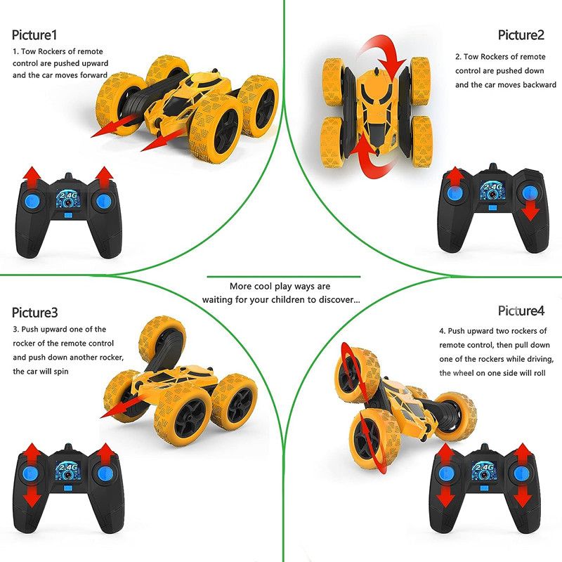 Comprehensive Upgrade, Unlock Novelty: Our newly arrived RC stunt car is designed with upgraded wheels, consisting of 9 separate arms and 9 TPR tires. As the car movesit automatically expands to enhance grip and gallops rapidly. It can tumble and flip at 360 degrees, and drive on both sides, which offers a thrilling and unique experience for children and even adults alike.Long-Lasting Fun: Featuring with upgraded 1400mAh battery, our remote control car can provide up to 90 minutes of non-stop action on a single charge, giving you plenty of time to perfect your stunts and wow your audience. So, grab your remote and get ready to push the limits with our long-lasting and exciting RC cars!Easy and Interference-Free Controls: With 2.4GHz interference-free control frequency, you can race multiple cars at once without any interruption, providing a seamless and enjoyable experience for kids and adults alike. Plus, the remote control uses 2 AA batteries (not included) and is easy to use, making it perfect for kids aged 6 and above to operate and have a blast.Safe and Durable: Made with high-quality ABS plastic and equipped with a stable structure, and high-class electronic elements, has been thoroughly tested to ensure it is safe for kids to use. The battery is also easy to remove and recharge, so you can rest easy knowing your child is playing with a safe and reliable toy.Perfect Gift Idea: Our RC rock crawler car runs well on sandy beach, grasslands or mountain land, suitable to play indoor and outdoor. Sci-fi style wheels make RC racing so cool, whether it's for birthdays, holidays, or simply because, our stunt cars are the perfect gift for any thrill-seeker in your life.