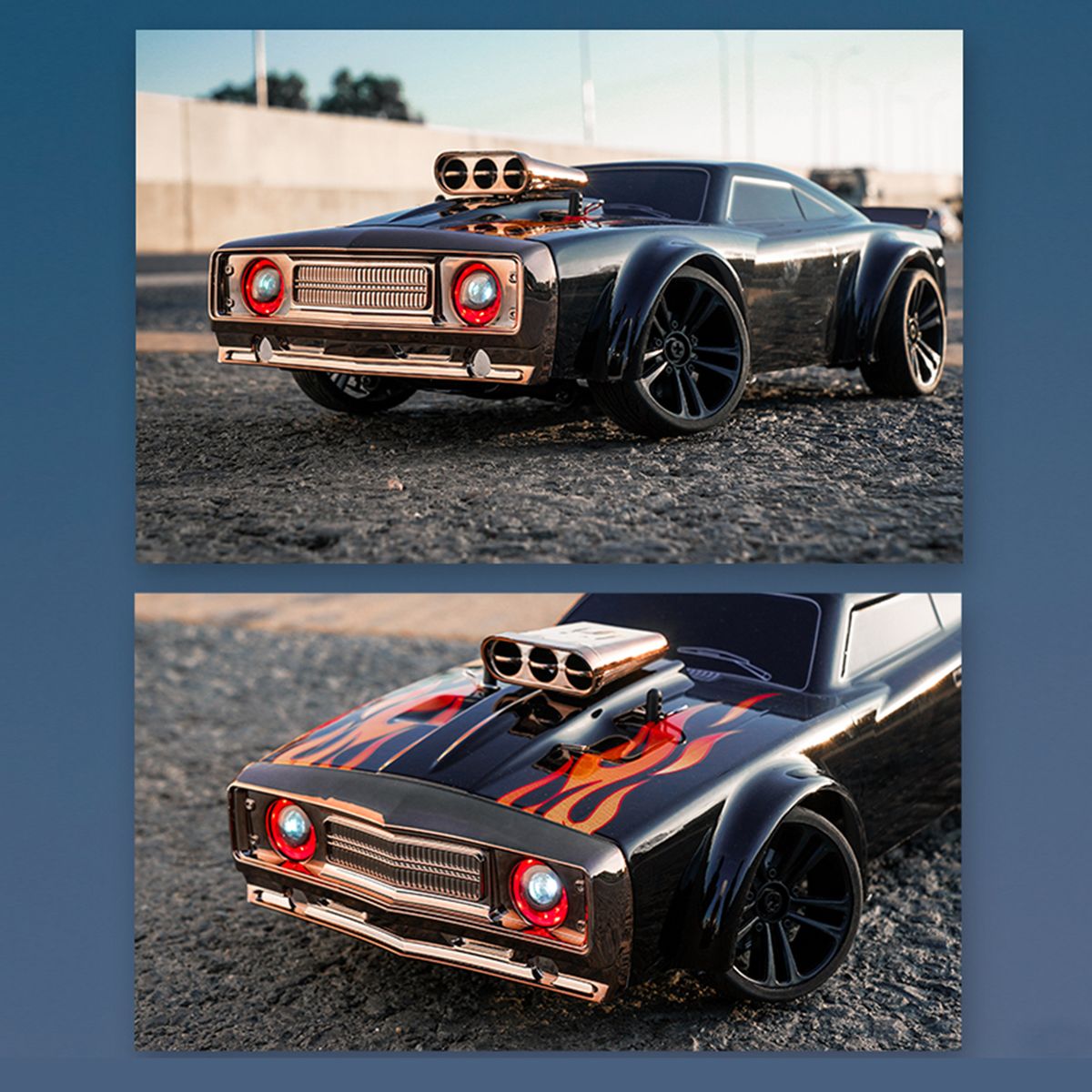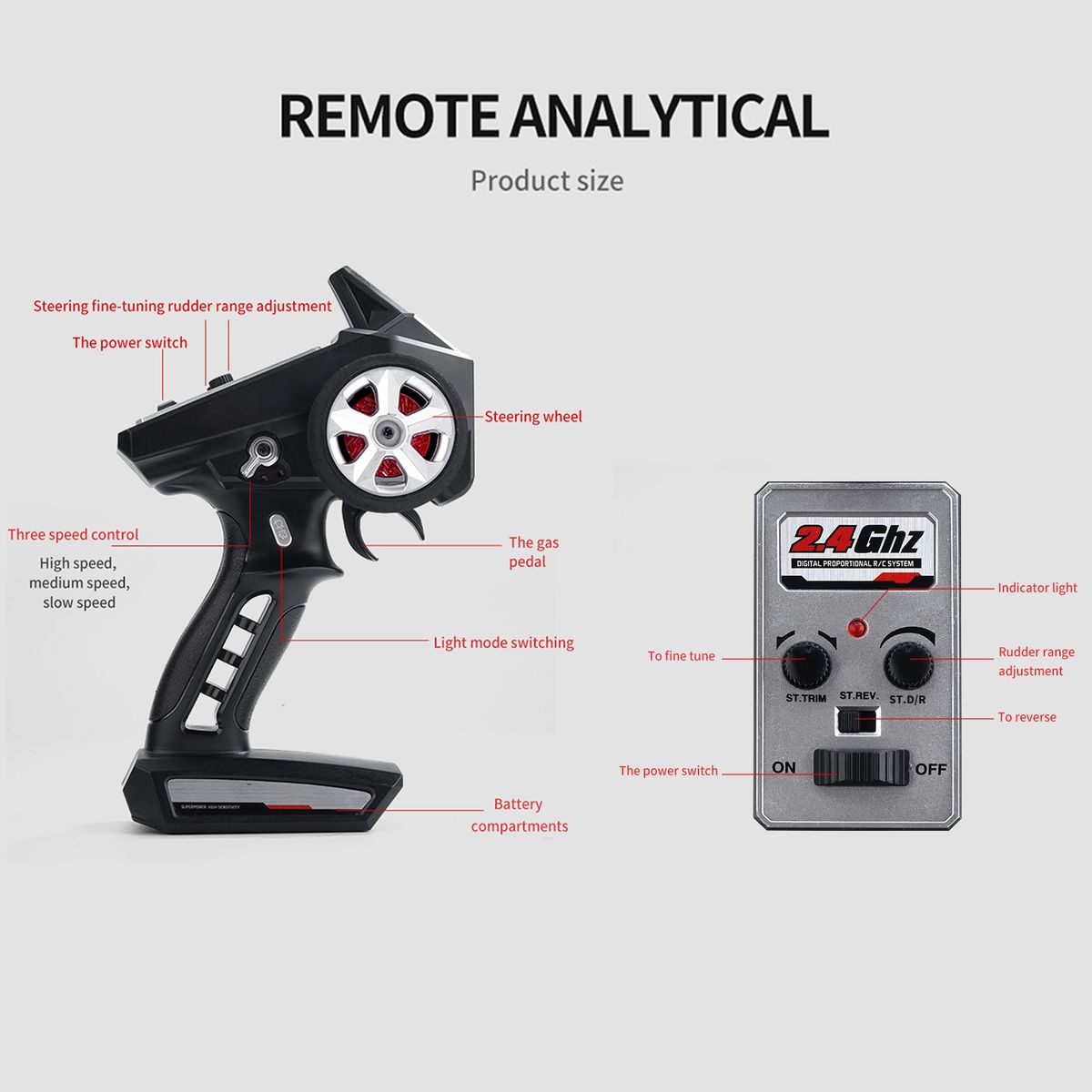 Adopting a simulation structure design, it has a real car handling feel, achieving full proportional continuously variable transmission, high-speed driving, rapid acceleration, deceleration, braking, reverse, left turn, right turn. Applicable venues: flat roads, cement roads, asphalt roads, and race tracks.