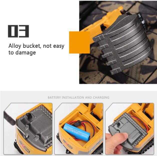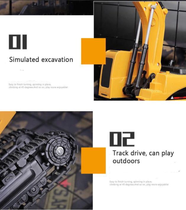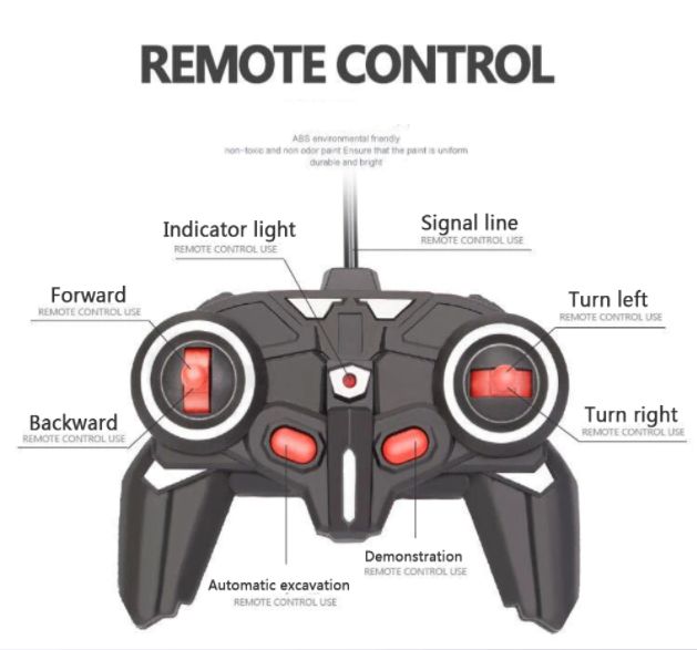 6 channelsDirection of movement: forward, backward, left, rightFunction: turn forward and backward, turn left and right. The arm goes up and down. Sound simulation.Transmitter frequency: 2.4GControl distance: about 30-50mPackage Option 1:1x RC Car1x Transmitter