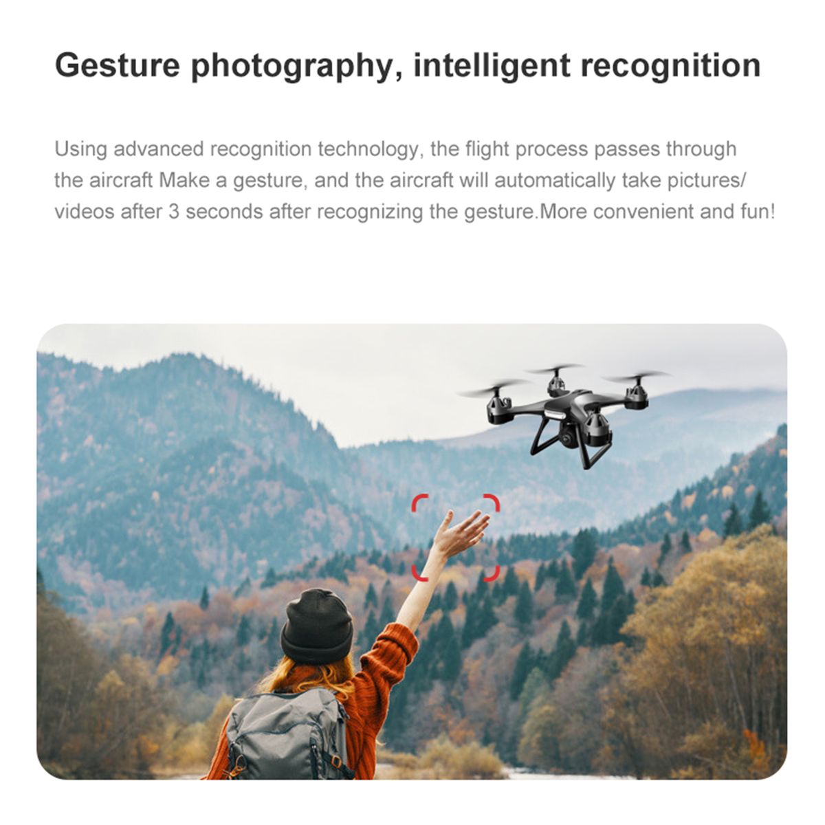 With One Key Takeoff/Landing and Gesture Control: It's more convenient to operate the when come across unexpected conditions and not have to worry about orientation, suit beginners. Gesture control mode allows you to order the camera to take a photo or record a video by just doing relative hand gesture.
