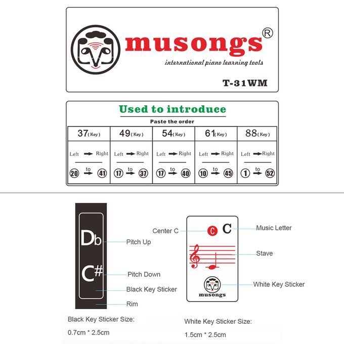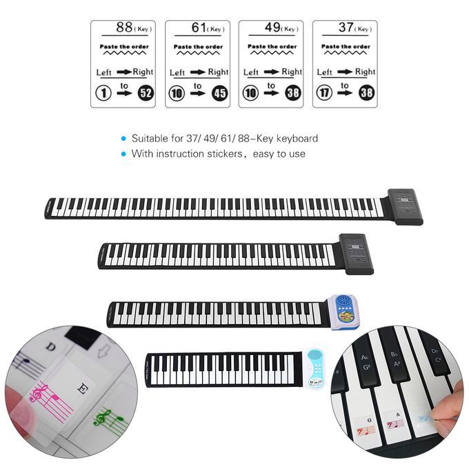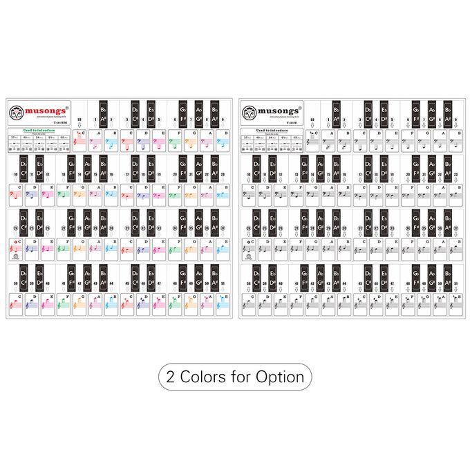 Stickers work for pianos & keyboards with 37/ 49/ 61/ 88 Keys, applied to the white & black keys.