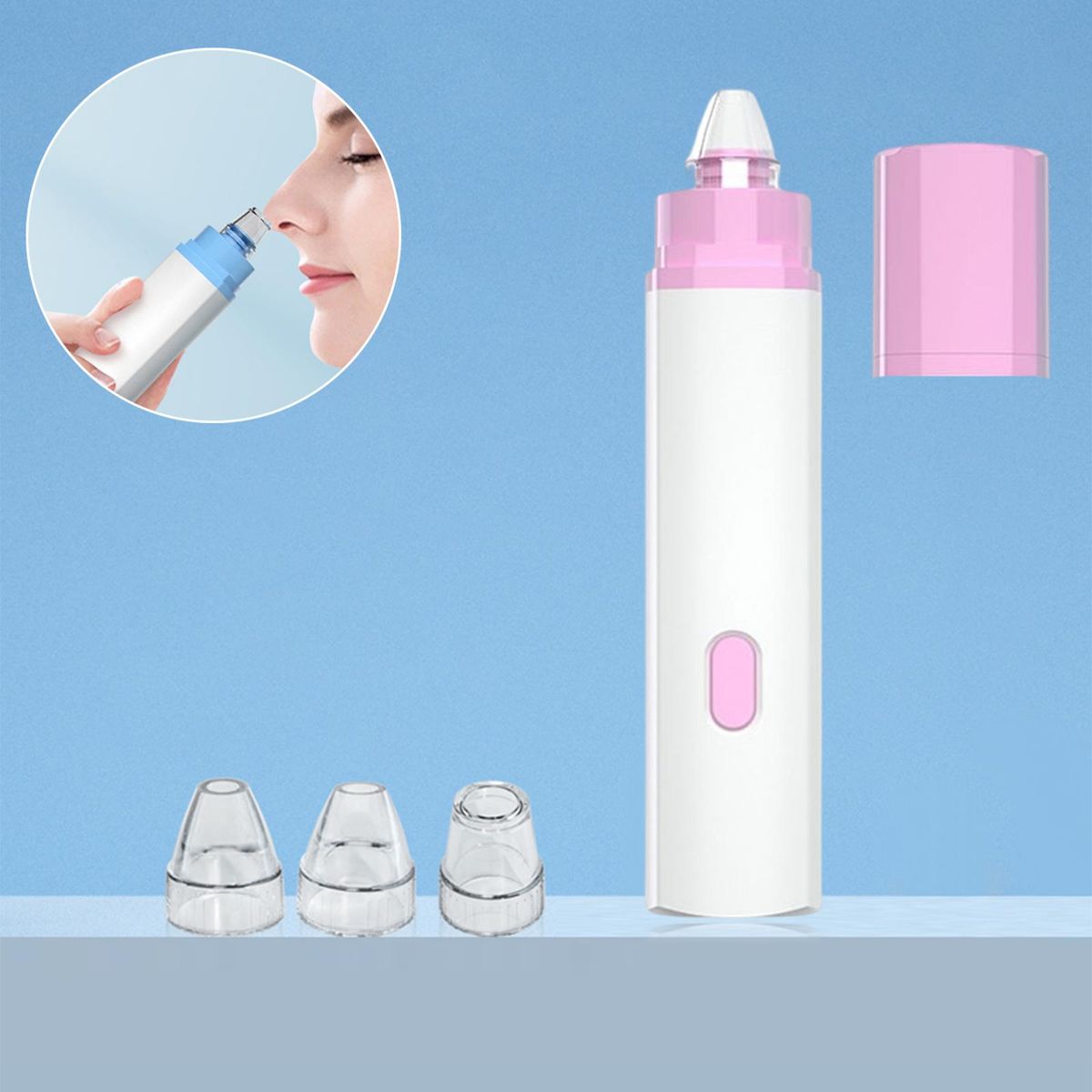 3 suction heads for free adjustment, widely suit different skin types. Small round mini tip, suitable for small areas such as the nose tip/perinasal, for local deep cleaning; Elliptical medium hole tip, suitable for nose wings, fit the curve of the nose circumference for multi directional cleaning; Round large hole tip, suitable for use around the nose, quickly removes blackheads of large areas.