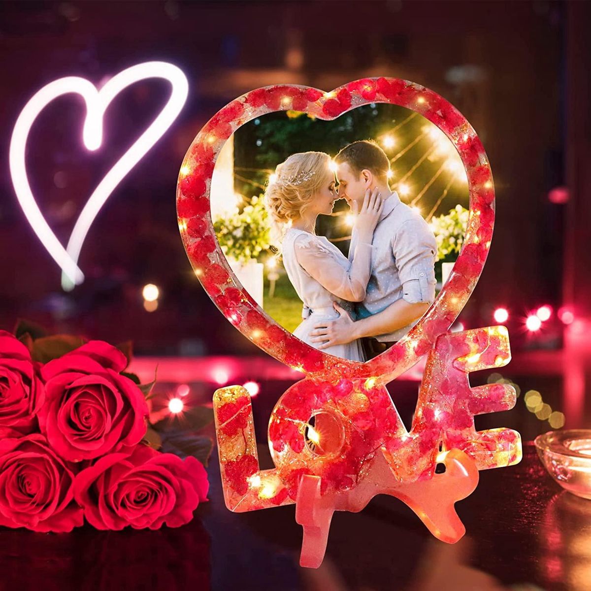 DIY unique craft - During DIY love shape photo frame resin molds silicone, you can add different fillers like glitter, dried rose flowers, mica powder, string lights or any elements you like as decoration. The finished craft has shiny glossy surface, great handmade gifts for your lover/ family/friends