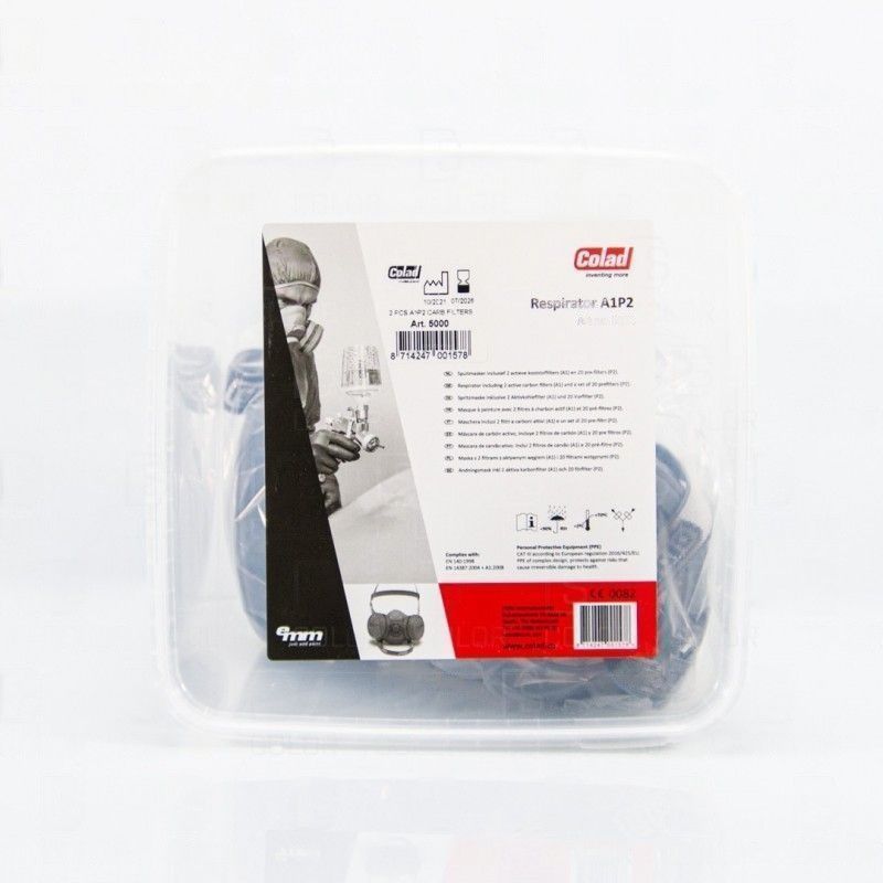 COLAD spray mask / face mask for optimal protection against inhaling isocyanide derived from paint and solvents. This COLAD spray mask is made of flexible plastic, so it fits perfectly around the nose and mouth. Thanks to the special headband this spray mask gives a very high wearing comfort, even for long-term jobs. Carbon Filters provide protection against the dangers of inhalation of hazardous materials like paint spray. Made of flexible synthetic material, which provides a good fit to the face, no leaking and good comfort.