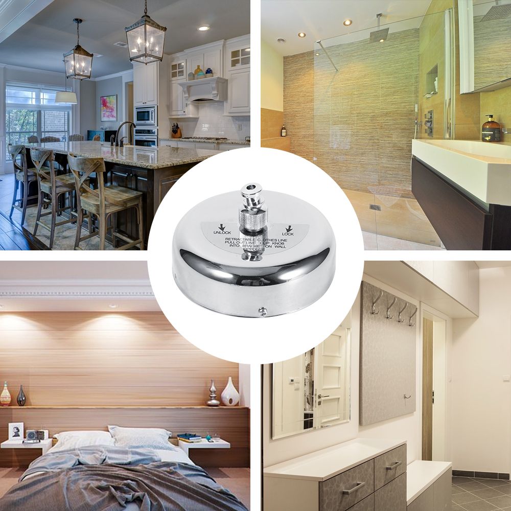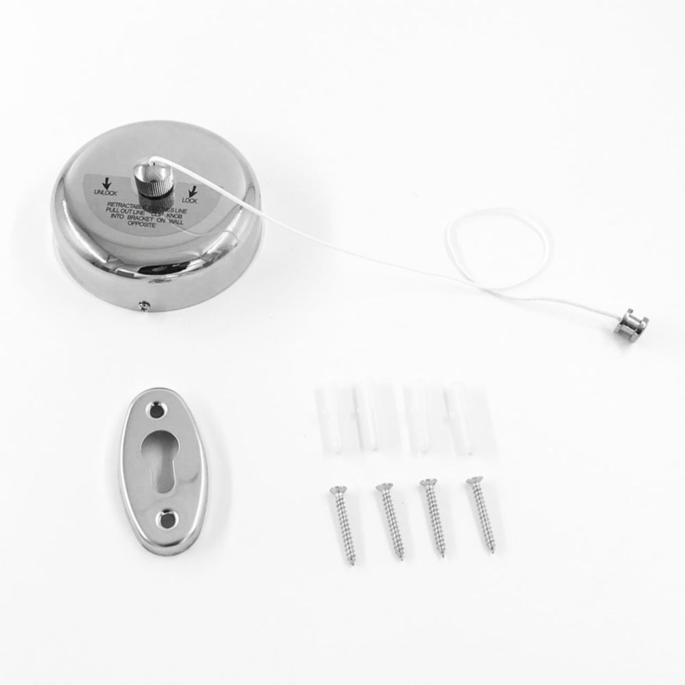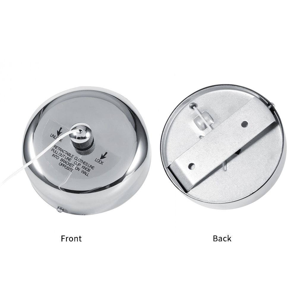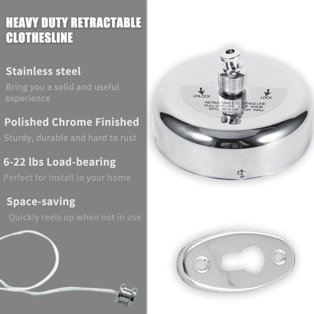 Retractable clothesline with polished chrome finished resistent corrosion and rust for durability. Adjustable retractable nylon rope laundry line can extend to 9.2 feet and quickly reels up when not in use, used for hanging wet bathing suits and baby clothes, etc.