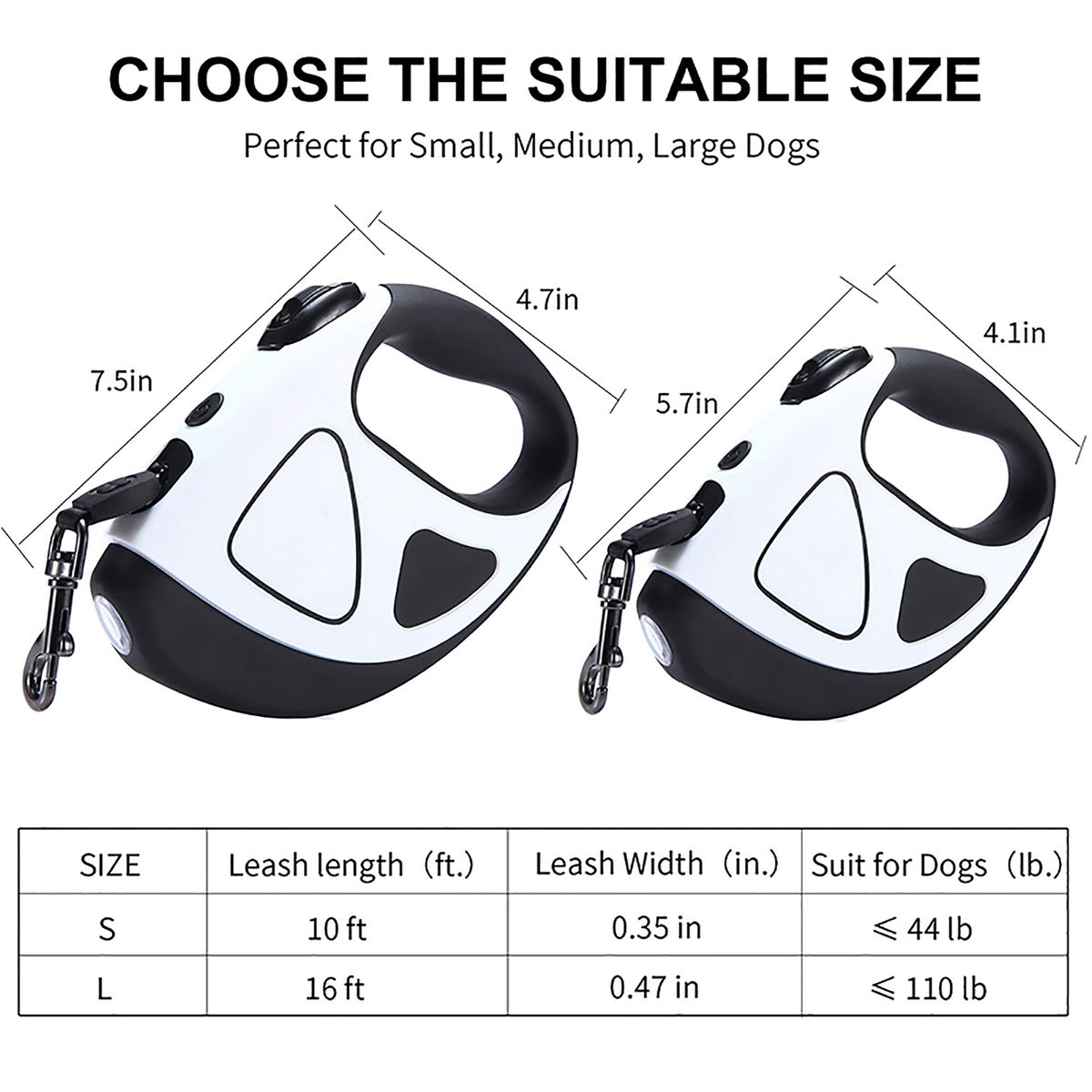 Two sizes: Small size extends to 10 feet for dogs up to 44 pounds and large size extends to 16 feet, perfect for dogs up to 110 pounds.