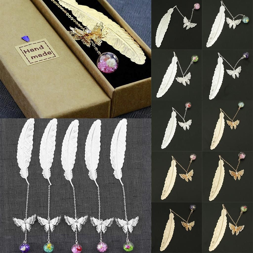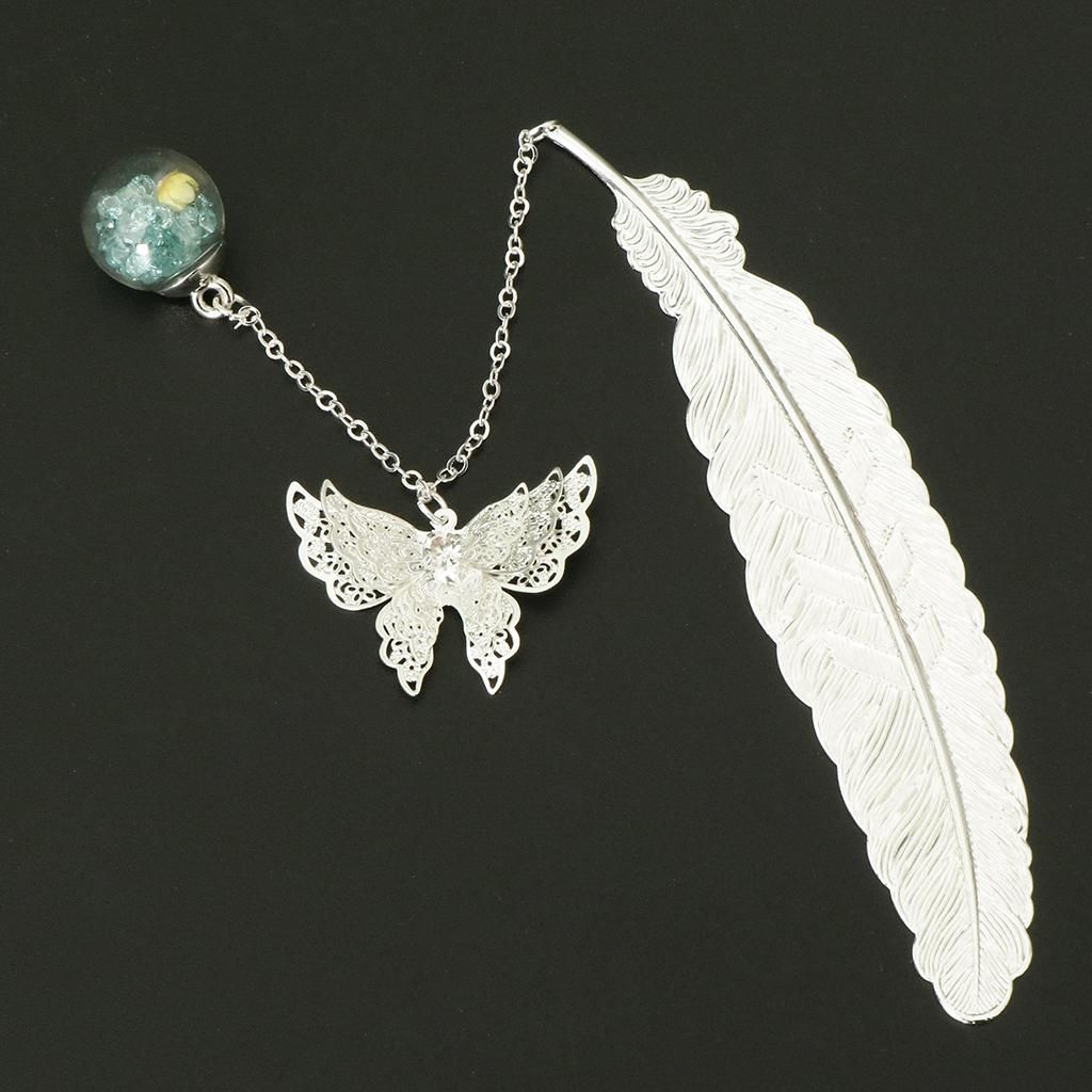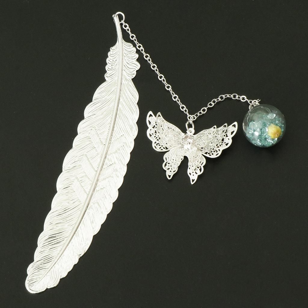 Feather Shape Bookmark with Butterfly Pendant Metal Creative Bookmark Stationery Mark - Gift Box Set
