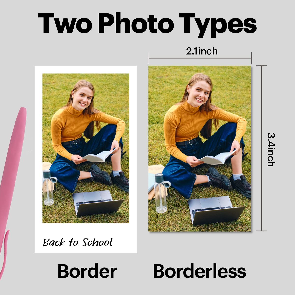 TWO PHOTO TYPES - The KODAK Mini Shot 2 Retro photo printer supports both border and borderless type photos. Write down your memories in the border type so they last forever. Print the borderless type to have larger sized photos.