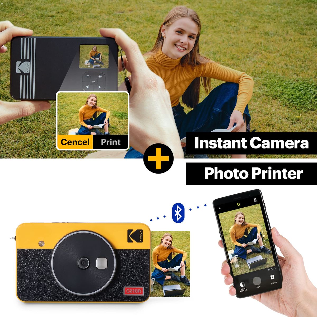 INSTANT CAMERA + PHOTO PRINTER - After taking fabulous shots with your KODAK Mini Shot 2 Retro, you have the choice to print or cancel, unlike other polaroid cameras. This instant camera can also connect to any mobile device through Bluetooth to print straight from the photo gallery.