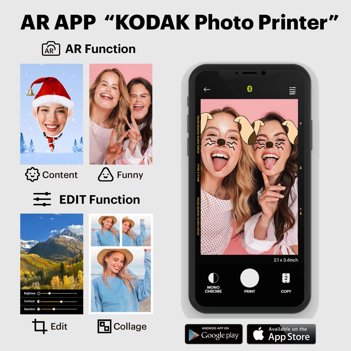 AR APP - Download the KODAK Photo Printer application to print anywhere and anytime. You can use the fun augmented reality features and other decorative functions like beauty, filters, frames, and more.