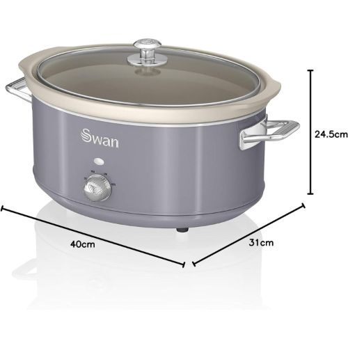 Swan Retro 6.5L slow cooker has a removable ivory colour ceramic pot, which can be taken straight to the table for serving. The low setting gently simmers food, while the high setting is great for cooking beans or pulses, as well as baking winter dishes such as crumbles. The automatic setting starts a dish on the high setting, which can be used to brown meats, before switching to low for the remainder of the cooking time, perfect for stews. An included 32-page recipe book provides inspiration for creating a versatile menu of tasty meals, while the handy keep warm function will keep dishes at the ideal serving temperature.The beautiful Swan Retro Slow Cooker not only takes the hassle out of cooking, but has 3 temperature settings that allow you to create delicious, slow cooked meals, packed with flavor. The Low setting gently simmers food, and the High setting is great for cooking dried beans or pulses. The Auto setting will cook on the High setting at first, then switch to Low setting for the remainder of the cooking time. A Keep Warm setting will ensure that your dish is at the ideal serving temperature.