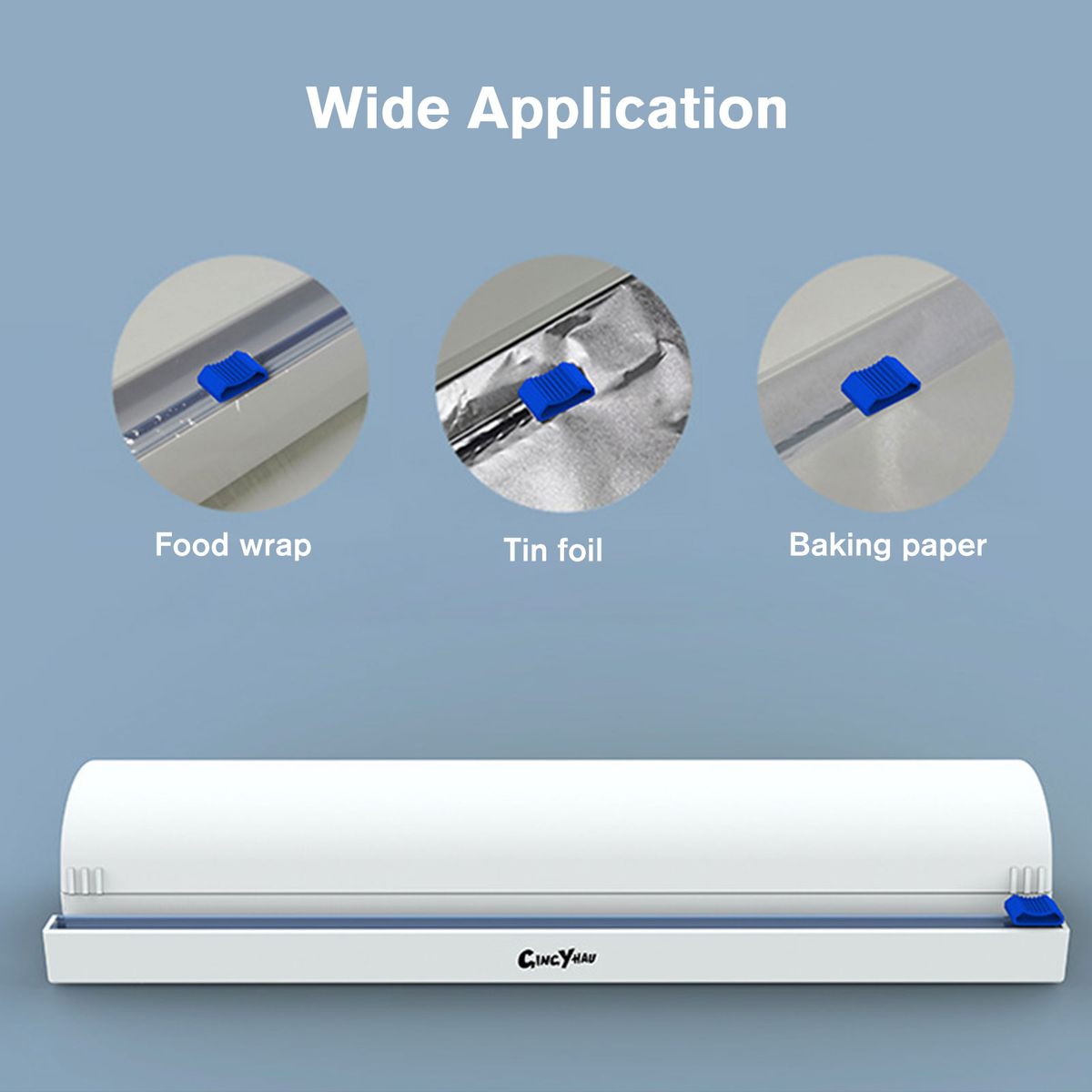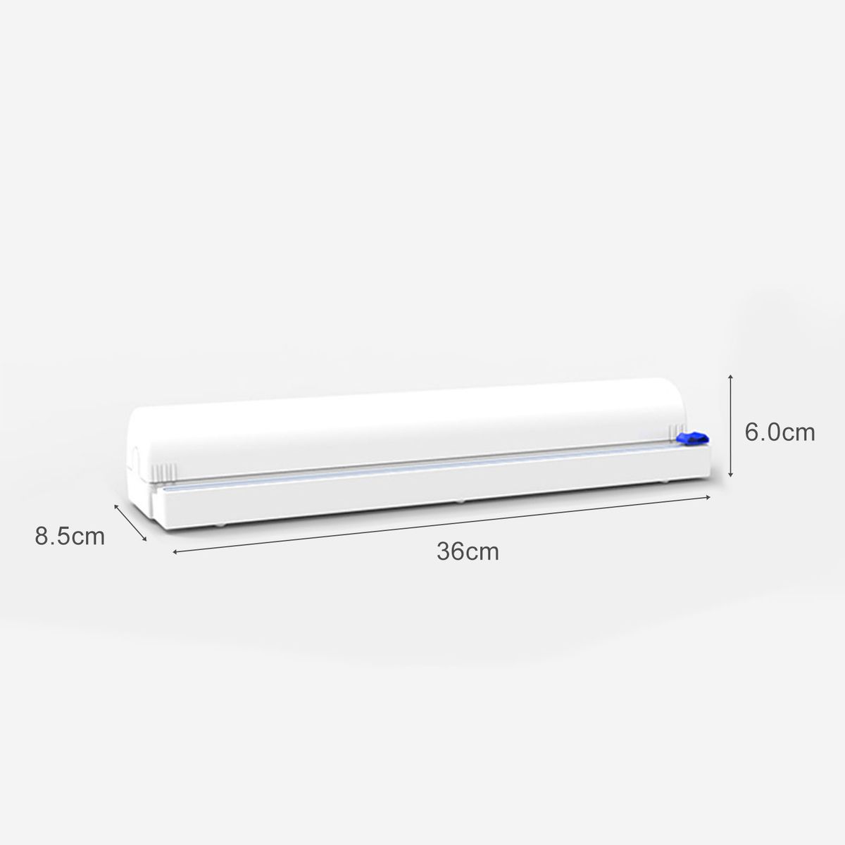 The size of the food wrap cutter is 36*8.5*6cm; it\'s suitable for cling film within a diameter of 4.5cm and a width of 15-30cm. It can be used for food wrap, tin foil, baking paper, etc.