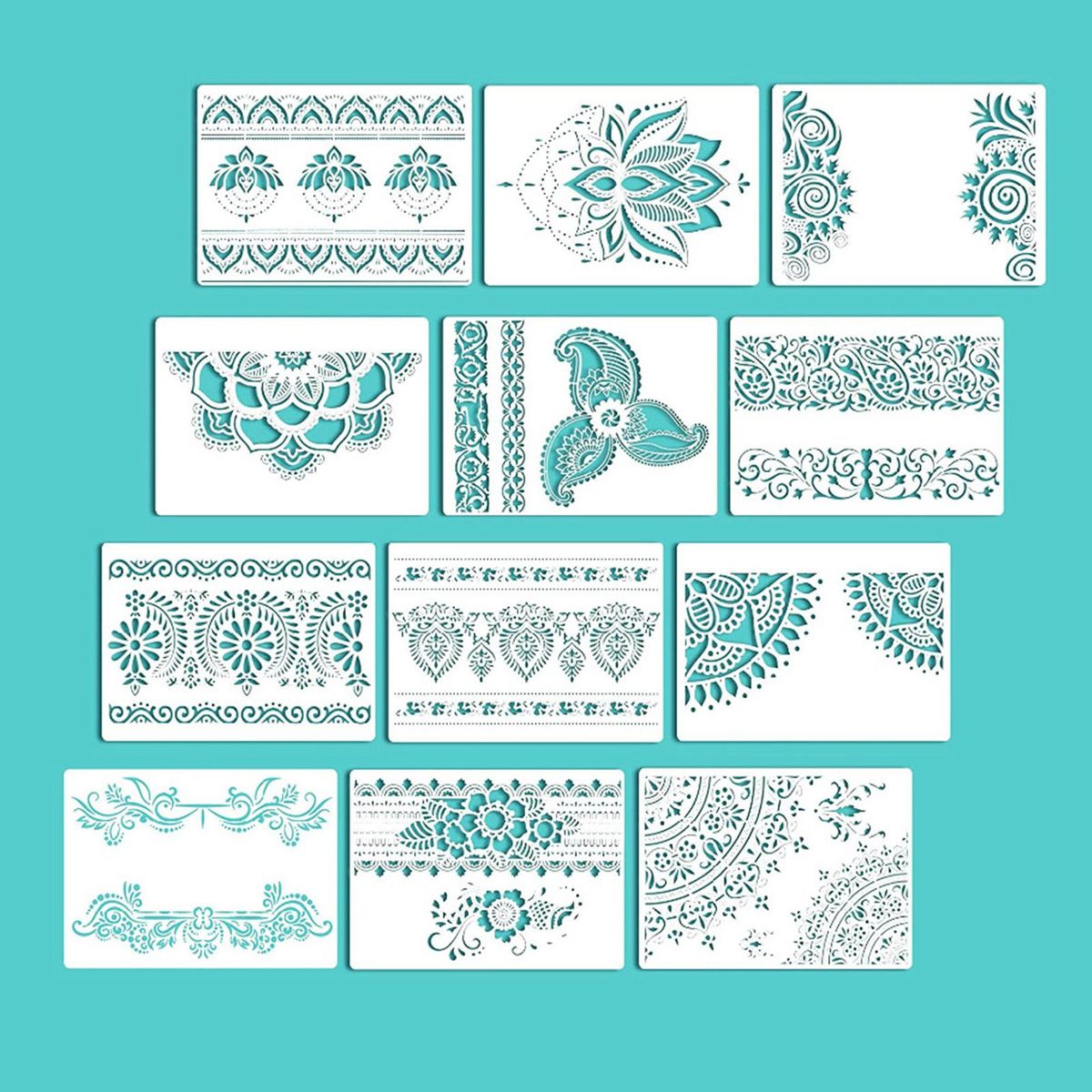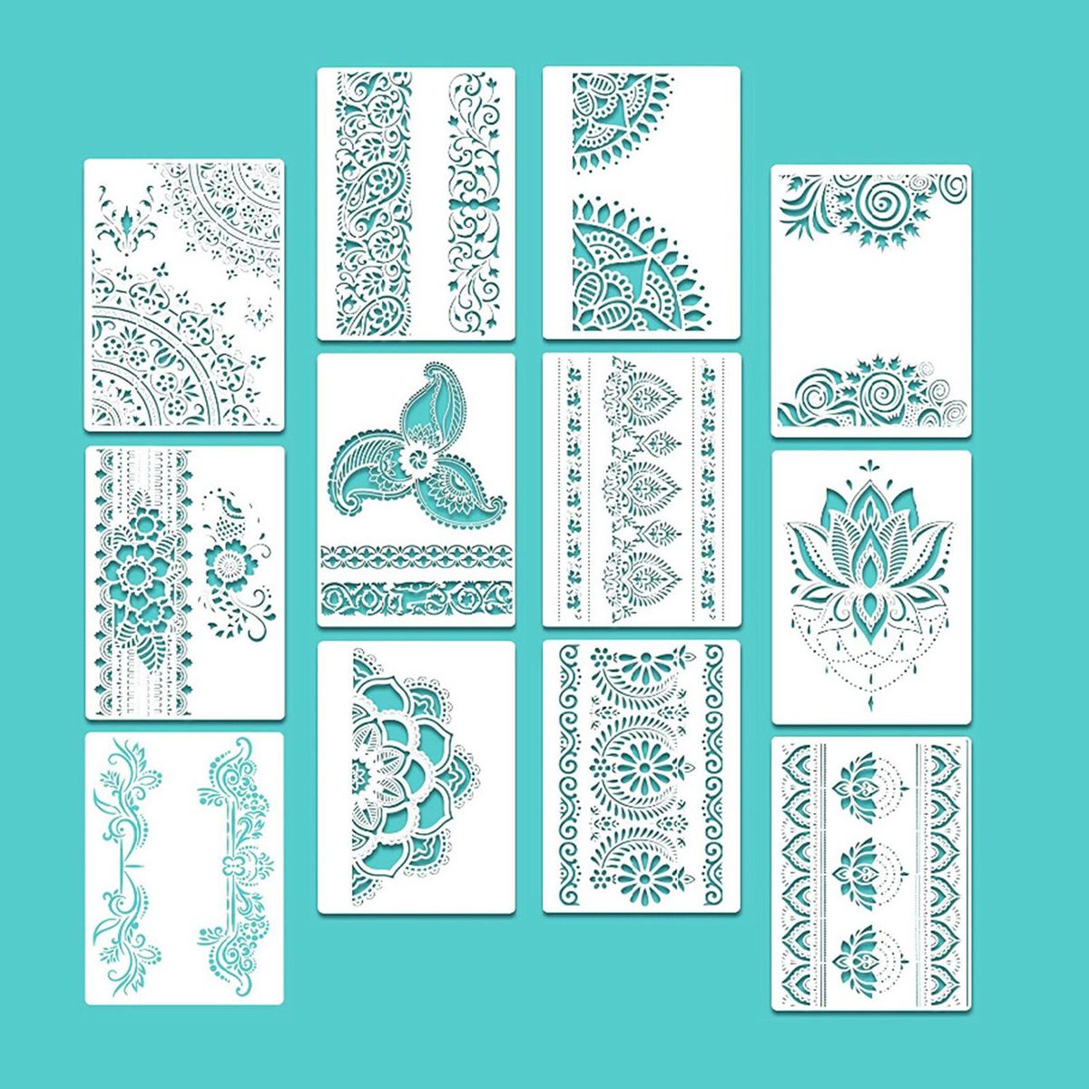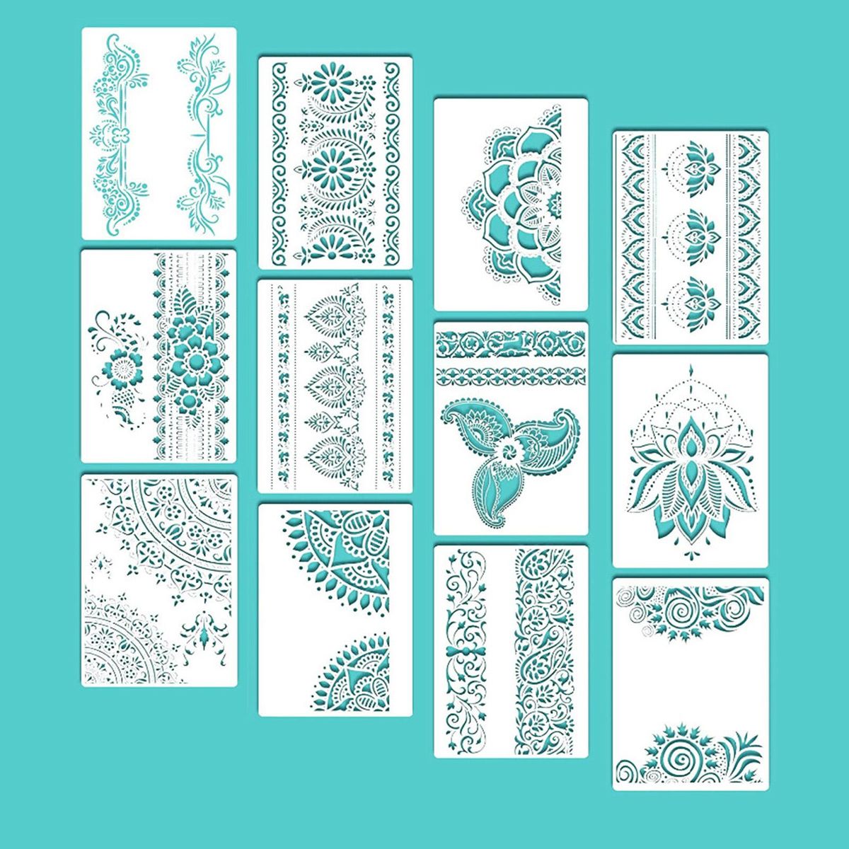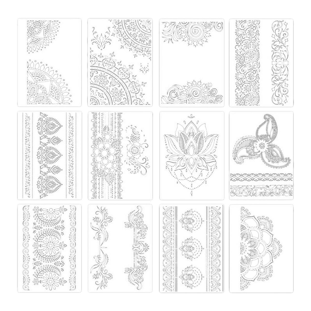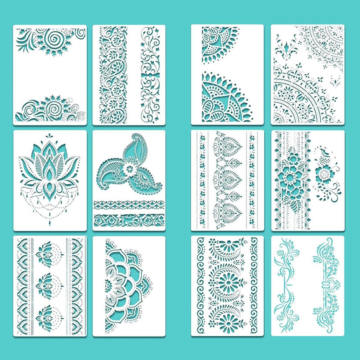 Made from environmentally friendly PET material, durable and reusable.A4 Sheet Size: 21x29cm/8.27x11.42 inchPackage Includes 12 sheets of StencilsSuitable for pigment, ink pad, , airbrush, hand painting.Widely used on fabric, wood, cloth, wall, furniture, etc.