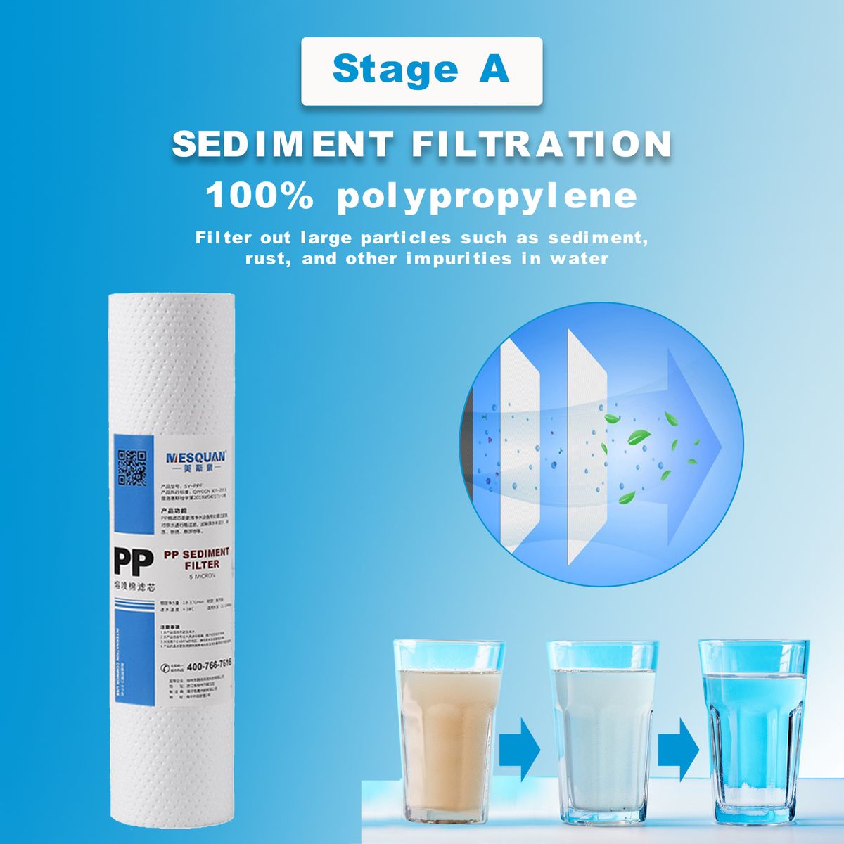 PP COTTON: Made of 100% food-grade polypropylene, it can filter out large particles such as sediment, rust, and other impurities in water.