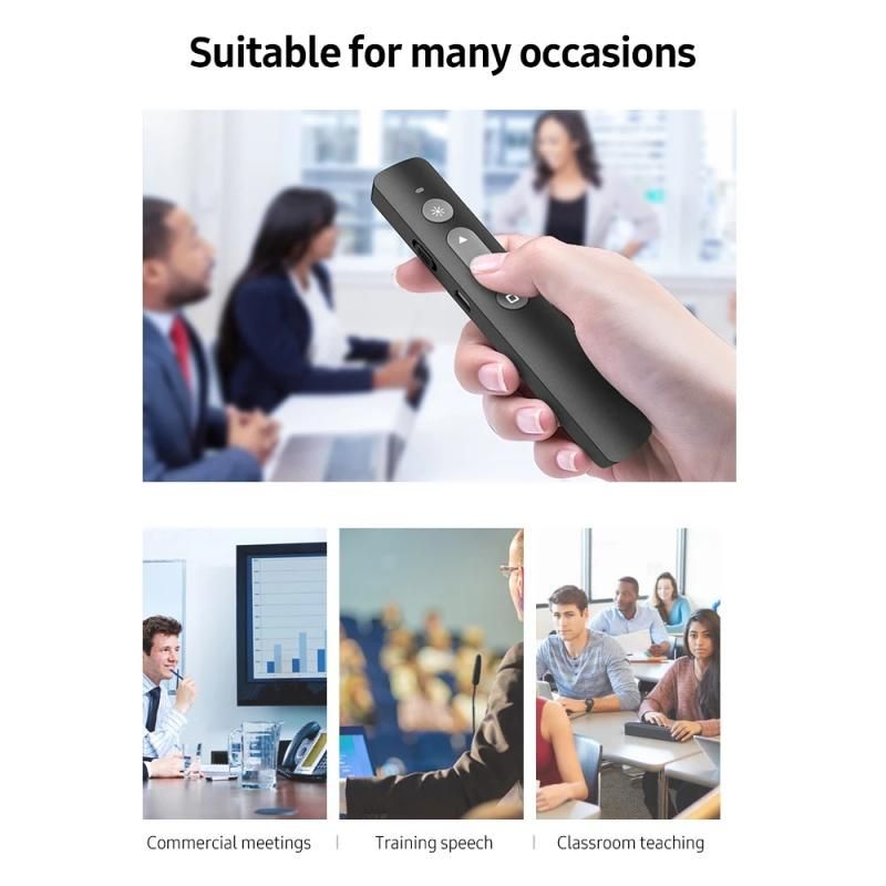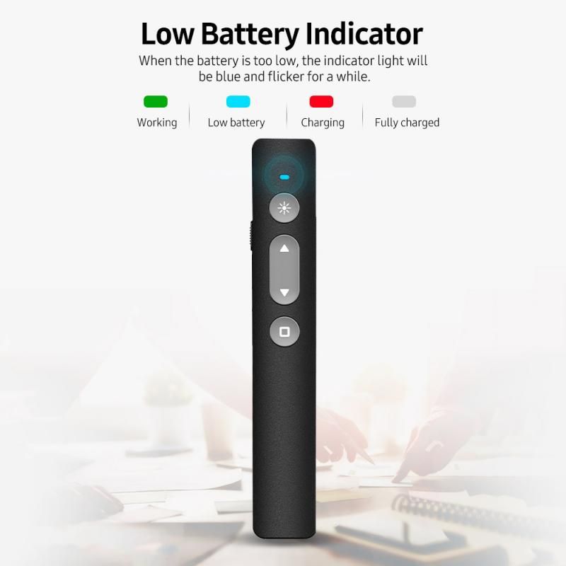 Description:Remote control distance: 100mRed light range: About 200mBattery: Lithium batteryBattery capacity: 200mAhRated voltage: 3.7VTransmitting technology: 2.4Ghz RFColor: Black, White, Pink ( Optional ) Item size: 130* 21* 12.5mmSpecifications:1.Low Battery Indicator.When the battery is too low, the indicator light will be blue and flicker for a while.2. Stable Transmitting. Adopting 2.4Ghz RF transceiver, it offers low power consumption and good performance, used widely in any kind of public occasions.3. Convenient & Quick Connection. USB receiver, plug and play. Be free of driver software.4. Charge it Anytime, Anywhere. Connected with USB cable, you can charge it with laptop, PC, power .5. Bright Red Light Pointer. A warm reminder for participants to catch each detail you speak.6. Wide Compatibility. Compatible with Win7/8/10, MAC/iOS, Android, Unix, Linux system and Office series page-turning format files.Package Included:1 * Multimedia remote control 1 * USB cable
