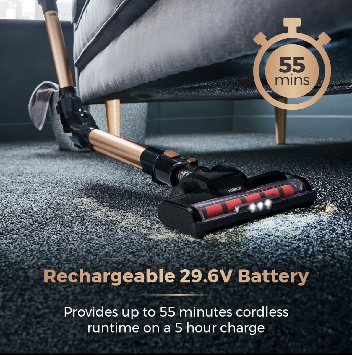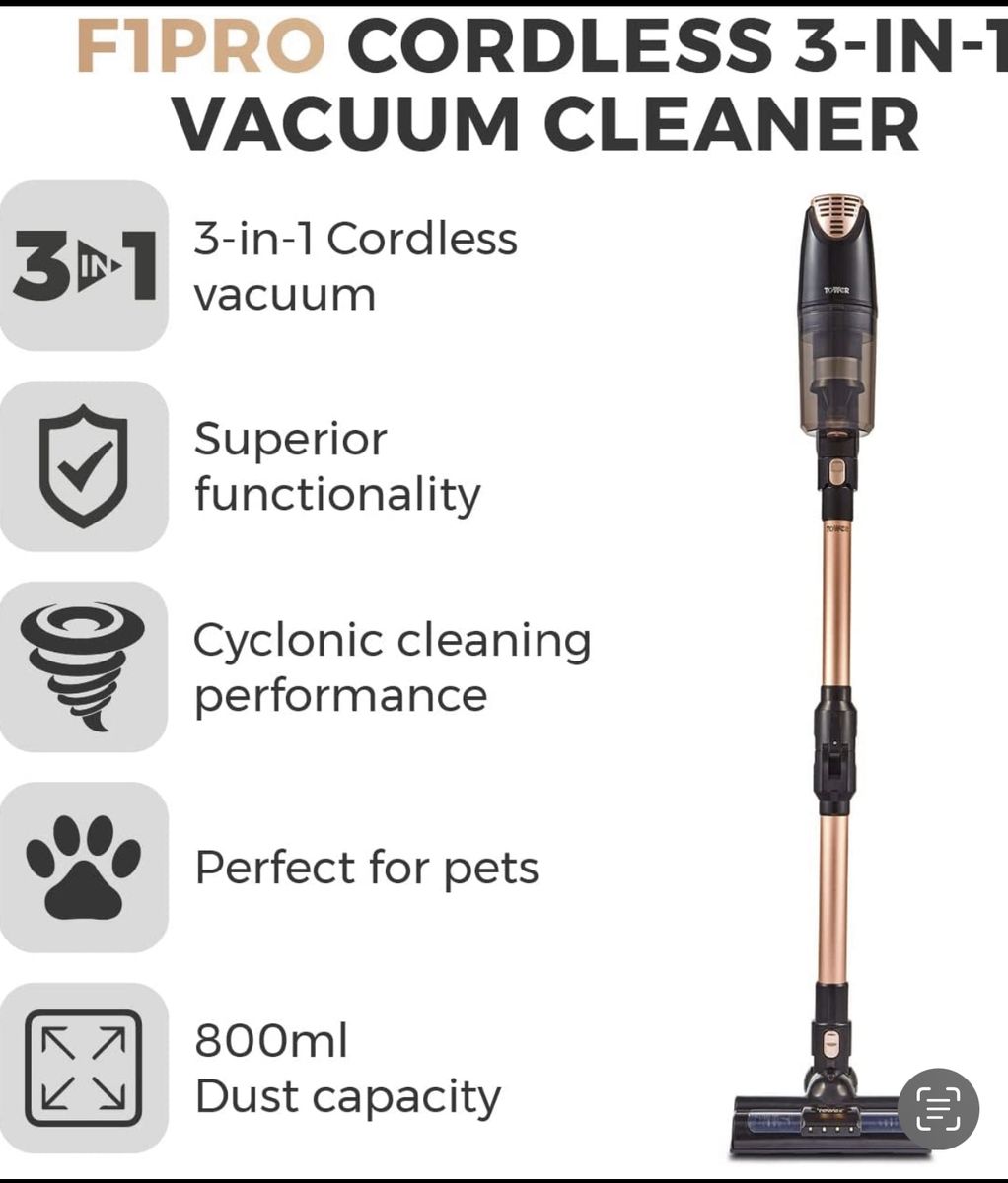 This Tower 3-in-1 cordless vacuum cleaner operates using a 140W motor to perform a thorough clean around the home. The versatile 3-in-1 design features a foldable telescopic tube that provides the flexibility when cleaning beneath furniture and above high cupboards, with a compact and detachable handheld that offers a lightweight performance between hard to reach areas, while the crevice tool and brush head attachments tackle cleaning on stairs and upholstery. Integrated with a rechargeable battery, a complete 5 hour charge can provide 55 minutes of unrestricted cleaning around the home. The mesh filter captures even the smallest particles of dust and dirt for an impeccably clean and healthy home environment.