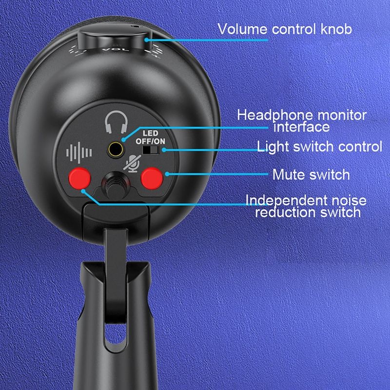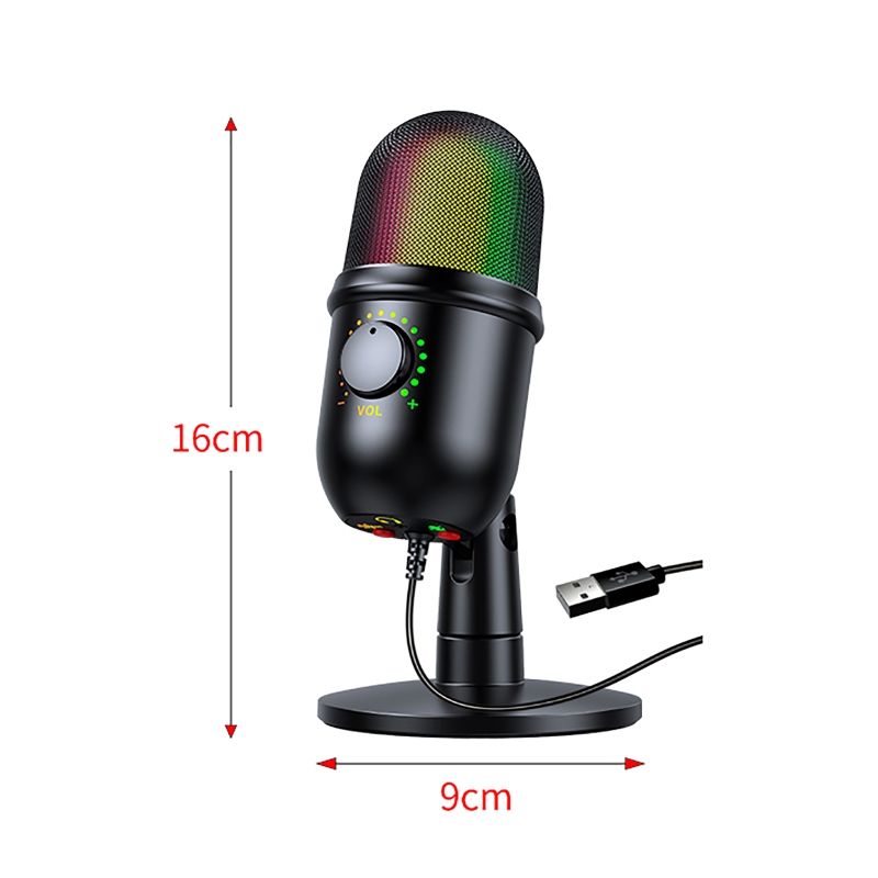 RGB USB Condenser Microphone Professional Vocals Streams Mic Recording Studio Micro For PC YouTube Video Gaming ComputerFeatures:* Plug and play, no driver required, compatible with mobile phones, computers, widely used in major APP platforms.* RGB lighting, e-sports cool psychedelic colorful lights, mesh head and tube body can emit light.* Stunning stereo sound. Built-in in-ear monitor plug, real-time monitoring, no delay, more advanced listening position recognition, so that you can live a more delicate listening experience, can clearly distinguish left and right channels, stereo.* Intelligent noise reduction, clear and precise pickup of each sound source, pure and full sound quality is still outstanding even in deafening environments.* Cardioid pointing, precise pickup. The cardioid pattern, often used in studio recording of vocals, is more sensitive to sounds in front, while other sounds will be attenuated and more accurate to replenish vocals.* The microphone can be rotated forward and backward, left and right, to obtain a more ideal angle.Specification:Name: USB condenser microphoneHead: condenserDirectivity: Heart-shapedFrequency Response: 30Hz-18KHzSensitivity: -34dB±30% (at 1KHz)Sound pressure level: 130dB(at 1KHz≤1%T.H.D)Signal-to-noise ratio: 78dBVolume control: supportIn-ear monitoring: supportNoise reduction: supportMute: SupportOutput interface: USB interfaceLine length: 2mSize: 16*9cmColor: black with patternPacking included:1 * USB condenser microphone1 * Stable base1 * User Manual