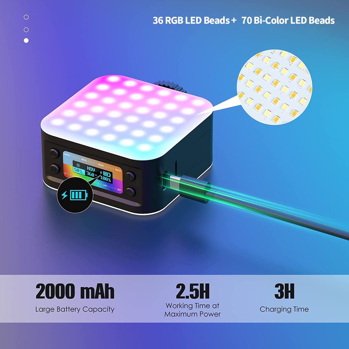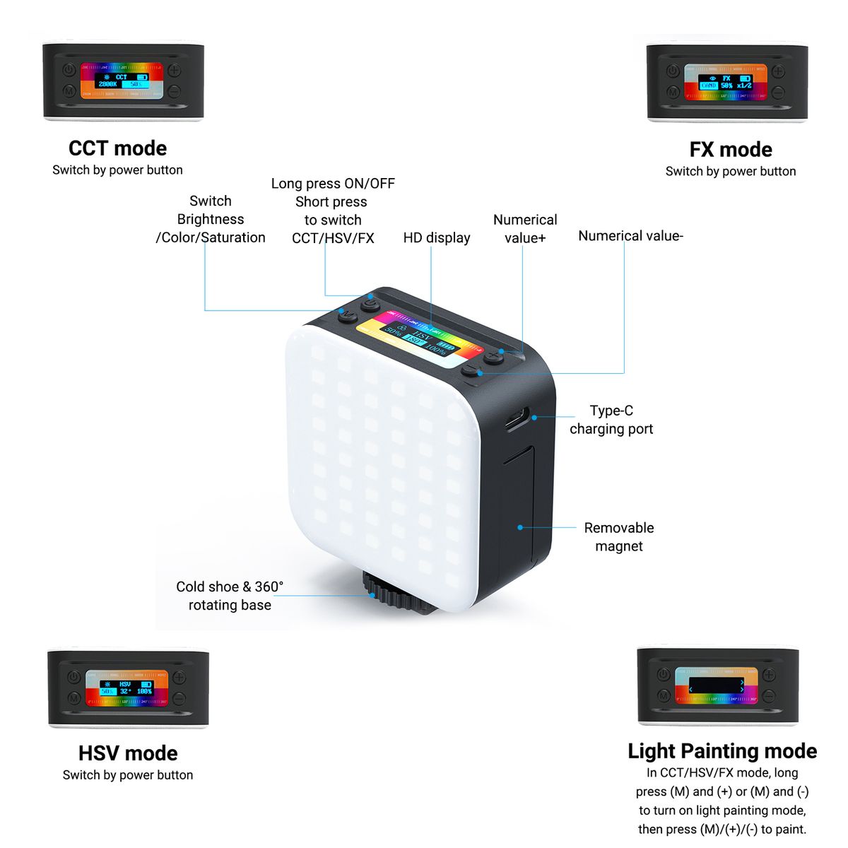 Product Specifications:1. LED maximum output power: 4W.2. Charging interface Type-C.3. Charging input: 5V/1A.4. Brightness range: 0%~100% adjustable.5.CCT mode: color temperature 2500-9000K, brightness (0-100%) adjustable.6.RGB mode: color gamut (0-359), saturation (0-100%), brightness (0-100%) adjustment.7.TLCI index: > 96.8. Color rendering index: >95.9. Maximum brightness: Max > 370LUX distance 0.5 meters, darkroom.10. Battery capacity: 2000MAH11. 36 RGB lamp beads, 35 cold and 35 warm color lamp beads .12. Injection frosted diffuser13. Net weight: 104g