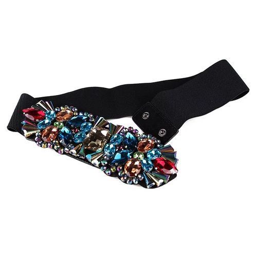 WAIST BELT: The designer waist belt have a width of 60mm / 6cm and length of 32 inches / 80cm & stretch up to 42 inches / 107cm. The fashionable waistband comes in black colour with rhinestones embellishmentSTRETCHABLE MATERIAL: This Women's waist belt has an elasticated waistband that can be stretched to provide a comfortable fitRHINESTONES BUCKLE: The Rhinestones buckle adds a classic and opulent look to the belt and makes it a perfect fashion accessory to wear with formal as well as casual wearGLAMOROUS DESIGN: This belt fashionably accentuates the waistline and creates a slimmer appearanceFASHION ACCESSORY: The belt can be used to create a fashionable colour blocking look for any long or short dress