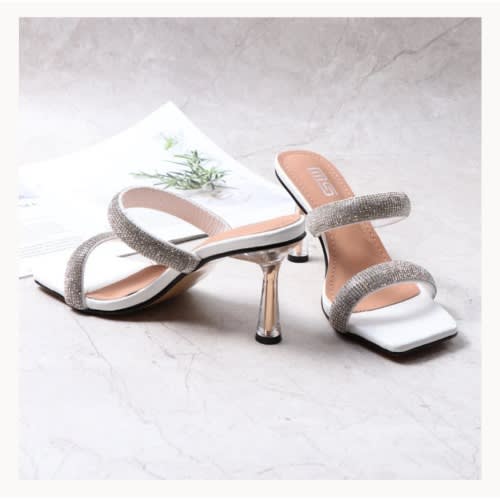 Buy Rhinestone Decor Two Band 8.5cm Stiletto Heeled White Slippers in Nigeria