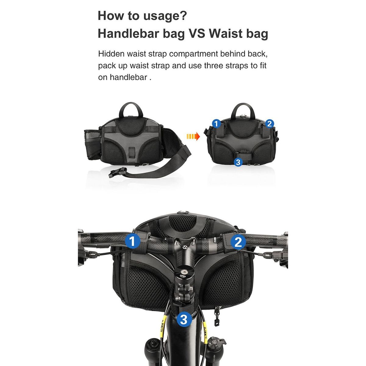 Detailed Information About The Product:How to change the front bag and waist bag: The back of the bag body has a hidden waist belt compartment, and the waist belt can be stowed when cycling, and the handlebars can be fixed by three straps.