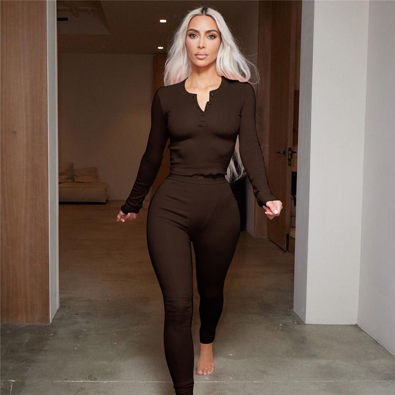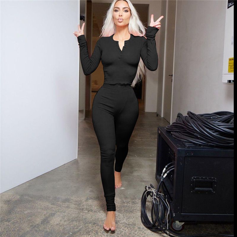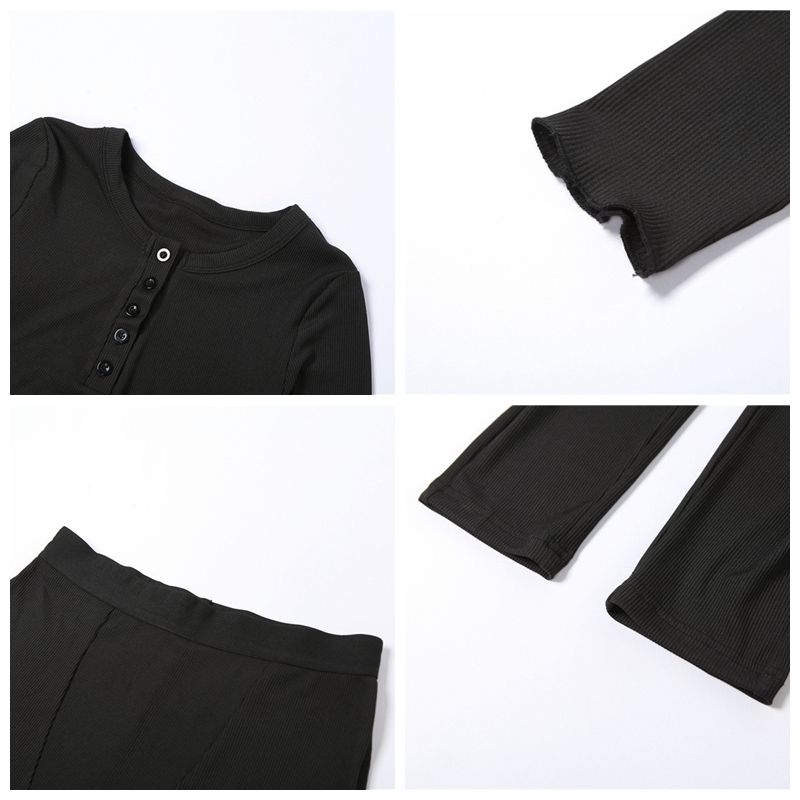Buy Ribbed Solid Two Piece Set Women Long Sleeve Skinny Tops High Waist Pencil Pants in Nigeria