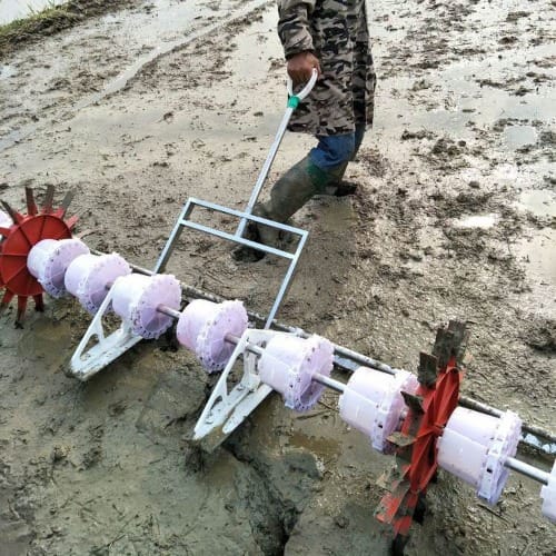 Rice Drum Seeder is a simple farm implement that is used to plant rice seeds, directly and efficiently in neat rows. As the machine is pulled , the cylinder driven by a ground whel rotates. As it rotates , seeds fall from the holes to the sliding surface rows.