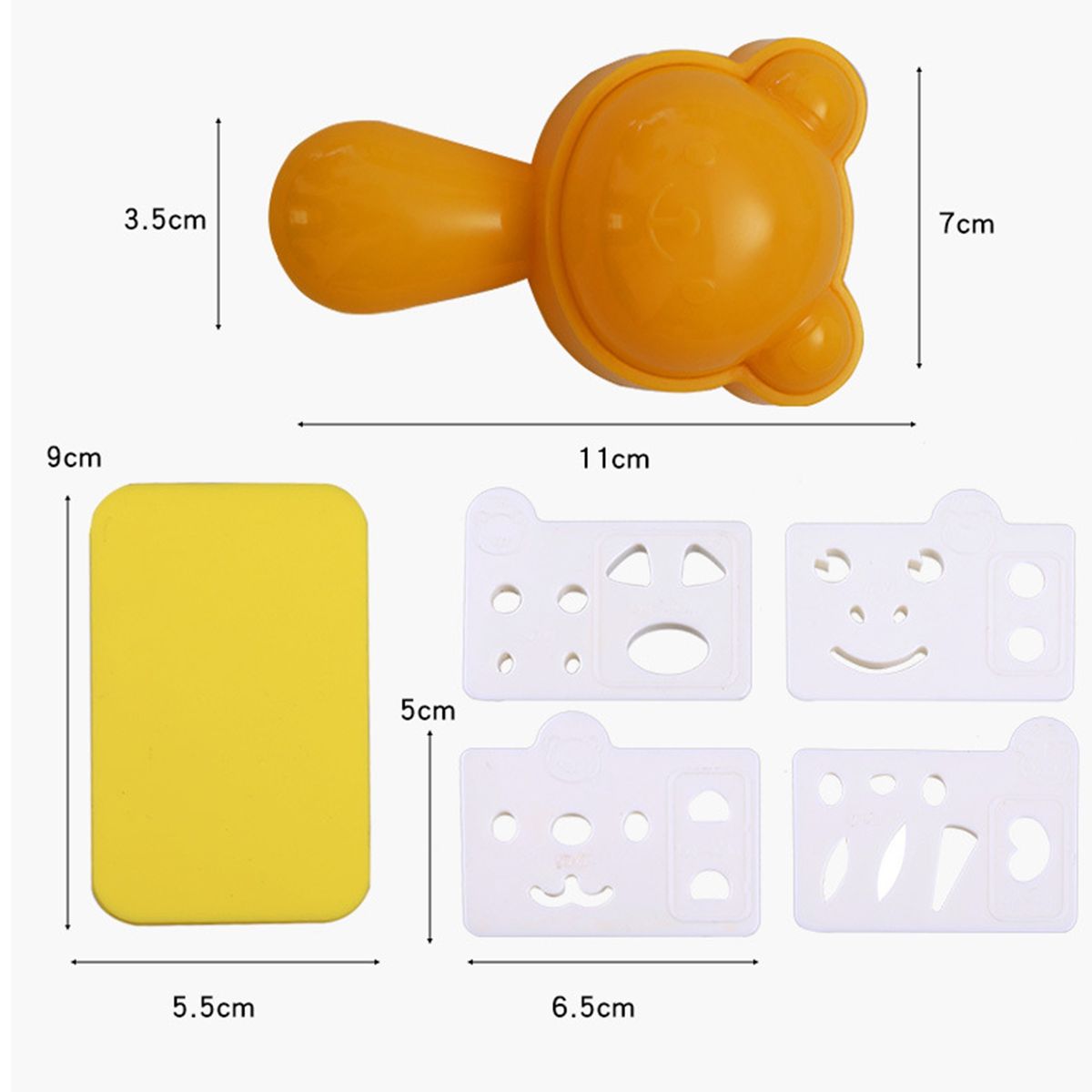 The length of the rice ball mold is 11 cm, the width is 7 cm. The length of the backing plate is 5.5 cm, the width is 9 cm. The length of the embossed plate is 5 cm, the width is 6.5 cm.