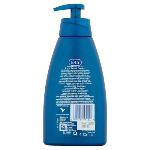 E45 Rich 24hr Cream provides fast absorbing, deep moisturisation that lasts throughout the day. This cream is formulated with evening primrose oil to help nourish dry skin without the use of added unnecessary colours or perfumes. The 400ml bottle features a convenient pump, for quick and practical application whenever your skin needs it.