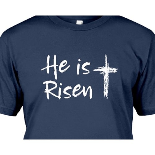 He is risen T-shirt is a navy blue cotton tshirt with a white print on it...
