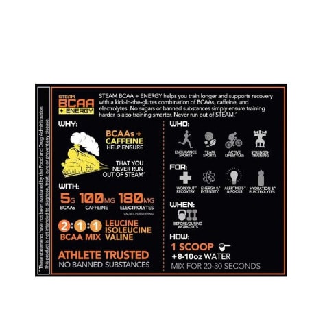 5 g BCAAs.STEAM BCAA + ENERGY helps you train longer and supports recovery with a kick-in-the-glutes combination of BCAAs, caffeine, and electrolytes. No sugars or banned substances simply ensure training harder is also training smarter. Never run out of STEAM.