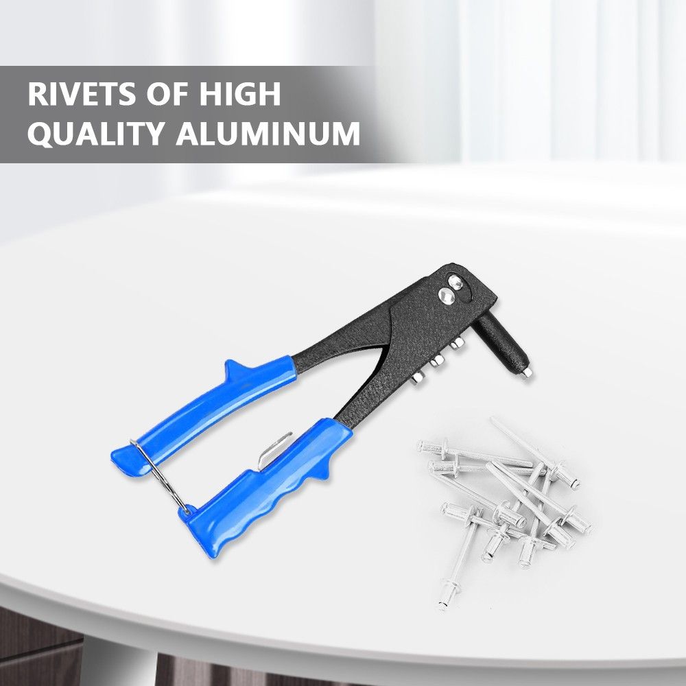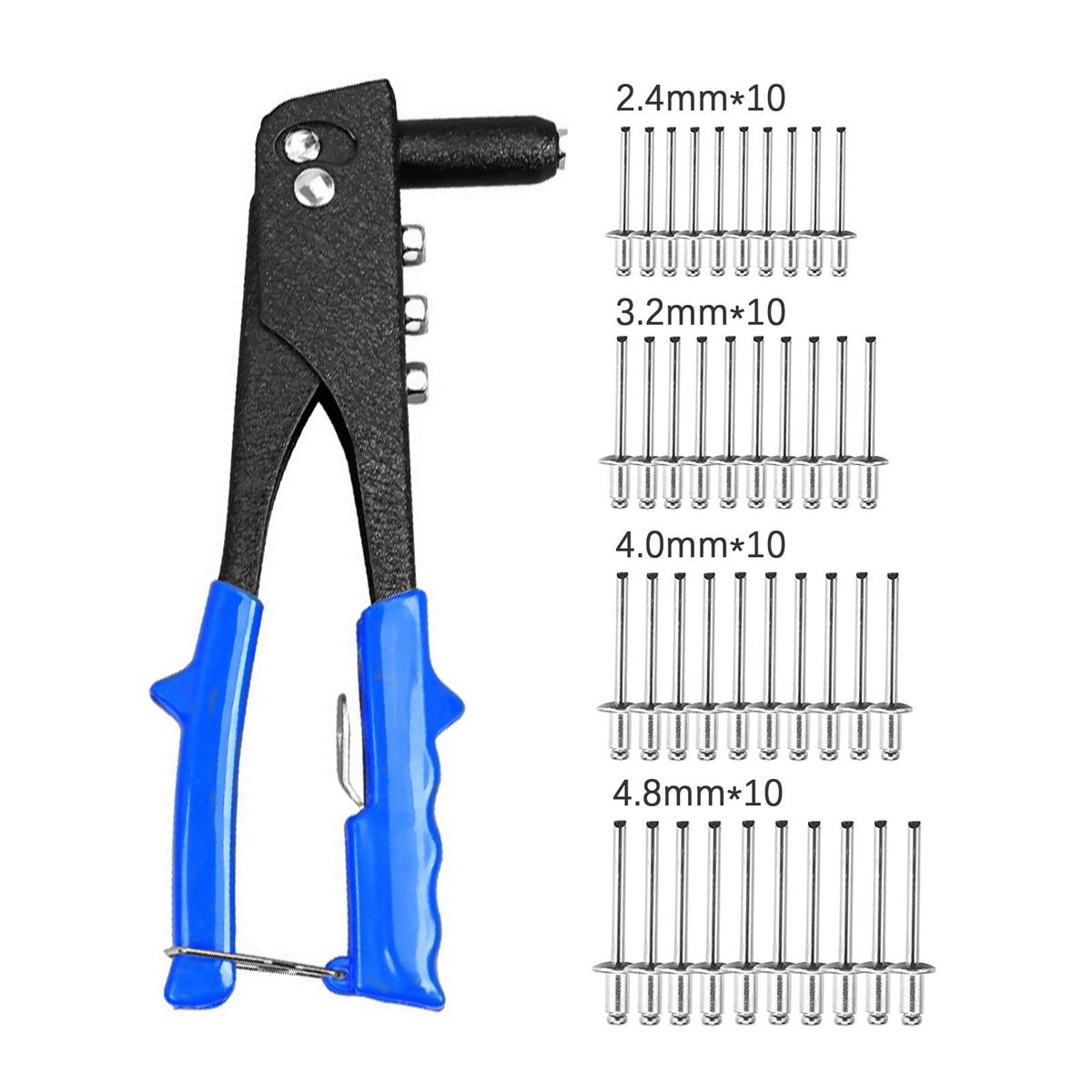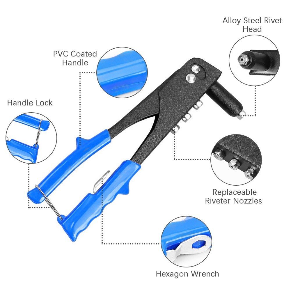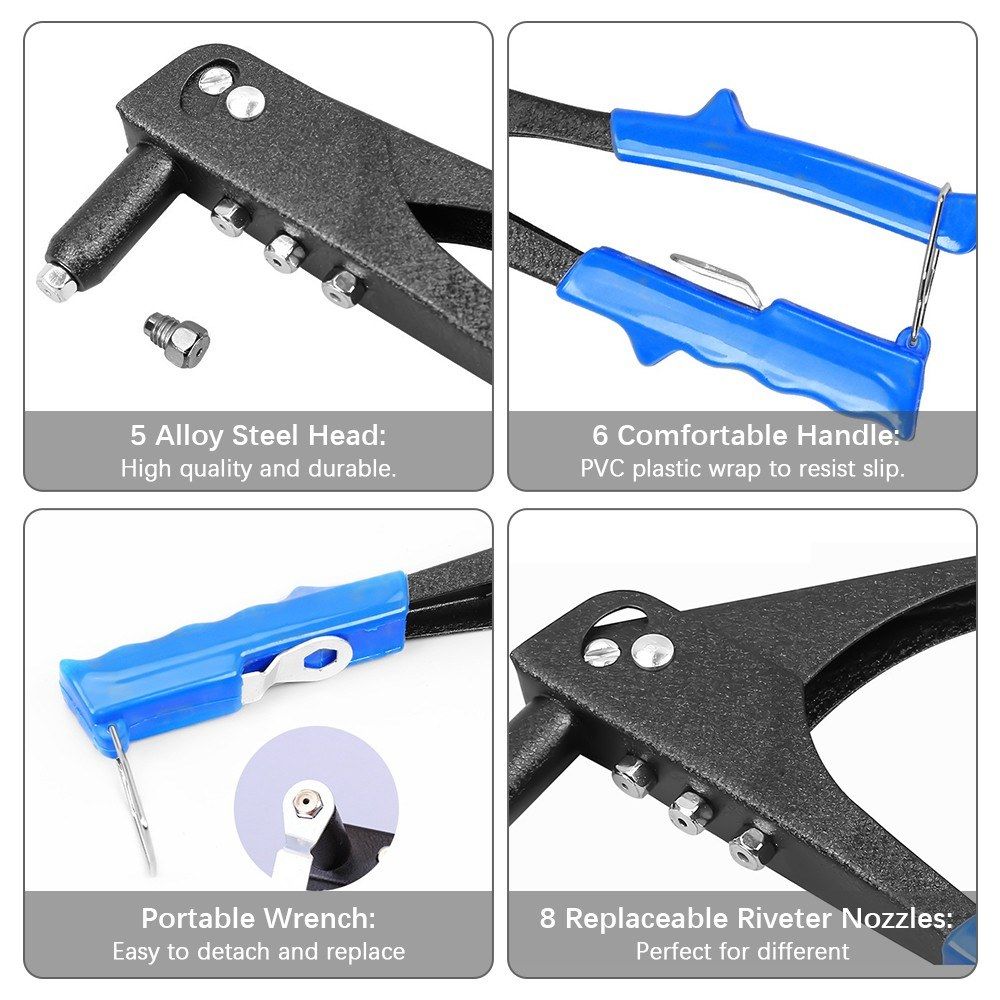 4 Interchangeable Heads: 4 interchangeable heads 3/32 quot;(2.4mm), 1/8 quot; (3.2mm), 5/32 quot;(4mm), and 3/16 quot;(4.8mm) are stored on the handle, which provides you with everything you need to start riveting. And we also provide 10pcs rivet per model.
