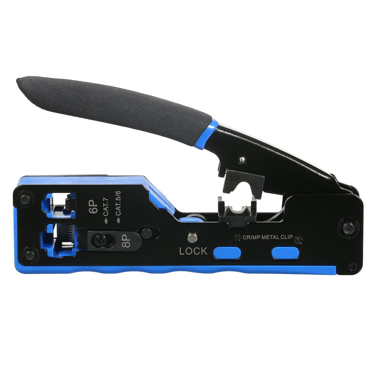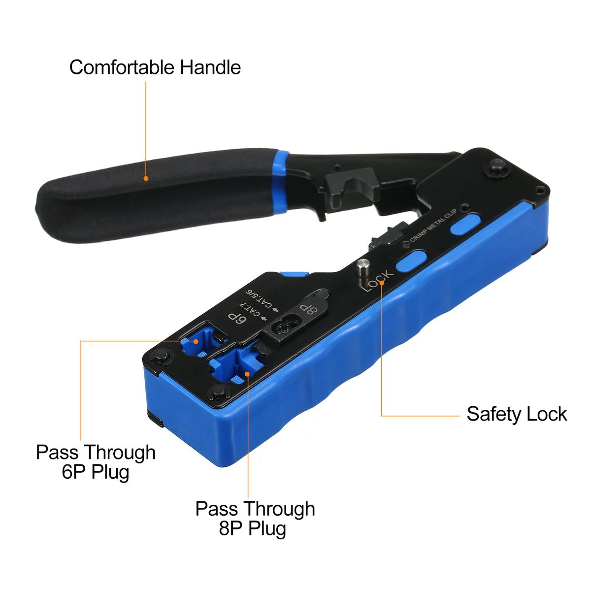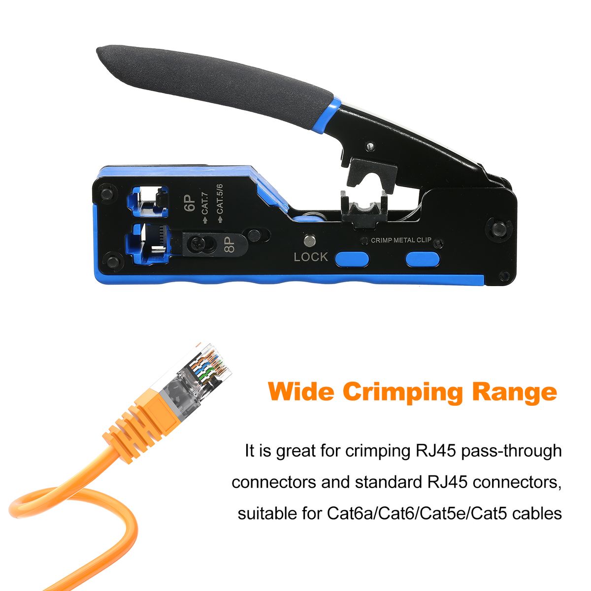 Our professional all-in-one premium quality RJ45 crimp tool kit is with pass through design, it can crimp RJ45 pass through connectors, this premium, long lasting tool RJ45 crimping tool has a wider range of use, which is suitable for Cat5/ Cat5e and Cat6/Cat6a cable using RJ45 pass through or standard connectors. Easy to use, convenient to carry.