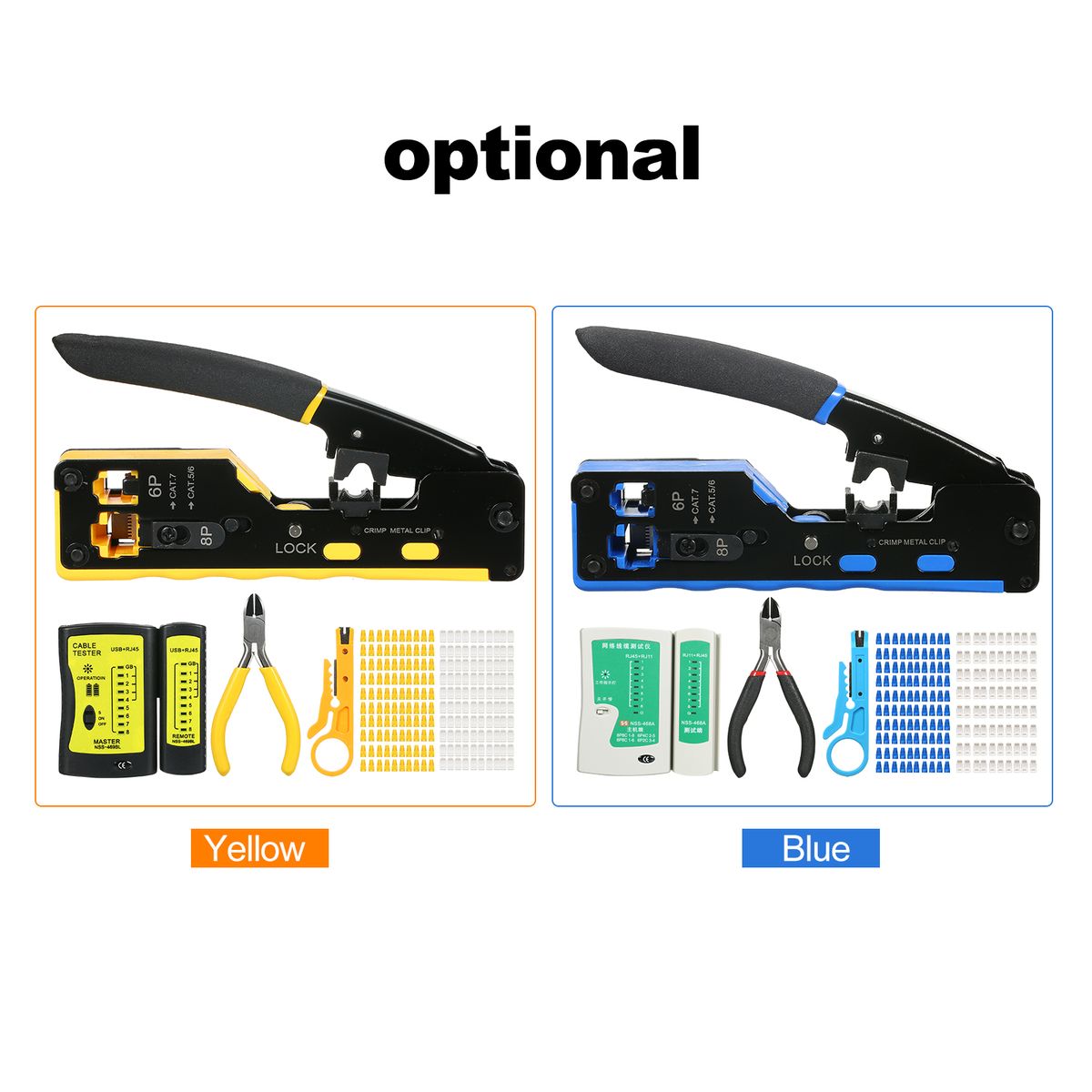【Packaging】1pcs x RJ45 crimper tool, 1pcs x mini wire stripper, 1x network cable pliers, 100pcs x gold-plated RJ45 cat6/5 pass through connectors (Maximum insulated wire outside diameter 1.1mm for 24~26awg cable), 100Pcs blue strain relief boots,1 set of blades(1xcrimping , 1x cutting and stripping ), 1xRJ11/RJ45 cable tester, 1x user manual.
