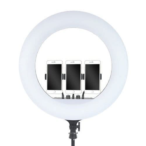 Flexible & Rotatable Phone Holder & ndash; ring light comes with 3 hot shoe ports that allow you mount 3 phones, and 2 USB charging ports for your smart phone charging while livestream. It & rsquo;s compatible with most smart phones with or without a case.