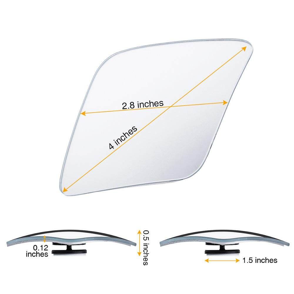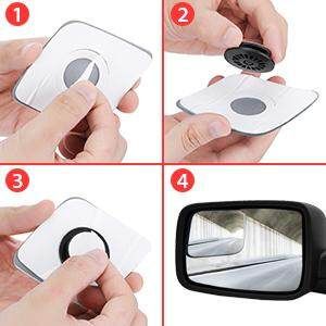-【GREAT VISIBILITY】- blind spot mirror gives you a view 3X larger and clearer than blind spot mirrors. Ingenious slightly convex design for wider vision, IP65 water proof, rust haze resistant, practical during rainy or snowy days, you know you can never be too careful on those days! -【ADJUSTABLE ROTATABLE】- rear view mirror features 360° rotatable and adjustable, maximize your view with wide angle in car. Unlike the mirrors with the bulky frame, frameless mirror won't take up a lot of space on the mirror making it a most handy car necessity. -【EASY TO INSTALL】- Equipped with strong adhesive weatherproof bonding strip to prevent the mirrors from falling off, sticky firmly and without marks after tearing off. -【PREMIUM QUALITY】- blind spot mirrors are made of waterproof HD glass, with curved face frameless ultrathin slim design, durable, sturdy and long lasting.