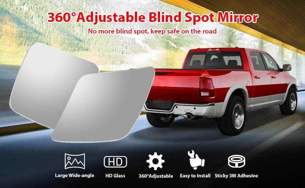 Product specifications: - Measurement: 2.8"x2.8" - Application: 2009-2018 Ram Truck -Mirror lens type: convex - Material: ABS, glass - Type: blind spot mirror Package Included: 2 blind spot mirrors 2 x 360° rotatable mounting bracket