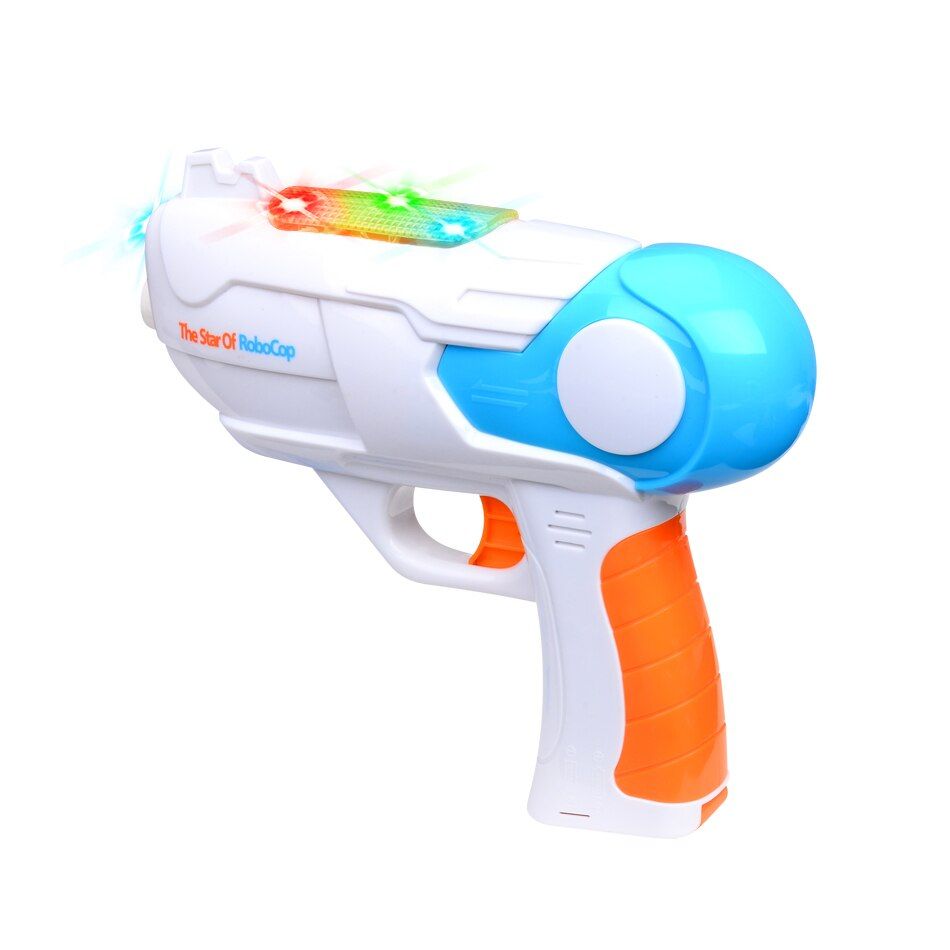 Material:ABS Plastic Shape:RoboCop Gun Color:orange/Blue Size:19*16*5.5 Battery:Not Send Use Battery:AA Battery