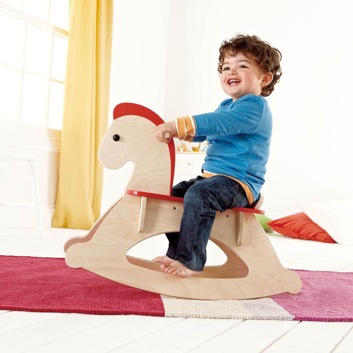 Giddy-up! This clever rocking horse adjusts to suit your growing child's needs. The guardrail can be removed and the backrest lowered as your little one gains the confidence to ride without support. Use the cushion to create a snug space for small babies and remove when they grow.Get ready to ride off into the sunset! This classically designed rocking horse makes a timeless addition to your child's collection. Constructed of wood with a water paint finish, the wide seat back assures safety as well as comfortable seating. Perfectly placed handles and footrest add extra security that helps kids learn to develop motor skills as early as ten months. Encourage your child in imitative role play as they mimic the sound of a horse, and begin to use their imaginations to create storylines about their adventures with their new friend. Hape toys stimulate children through every stage of development and help nurture and develop their natural abilities.