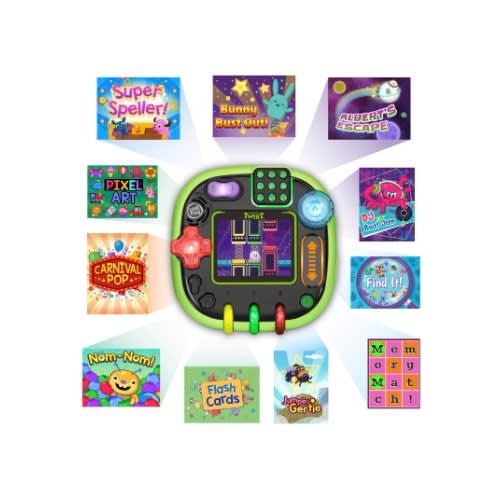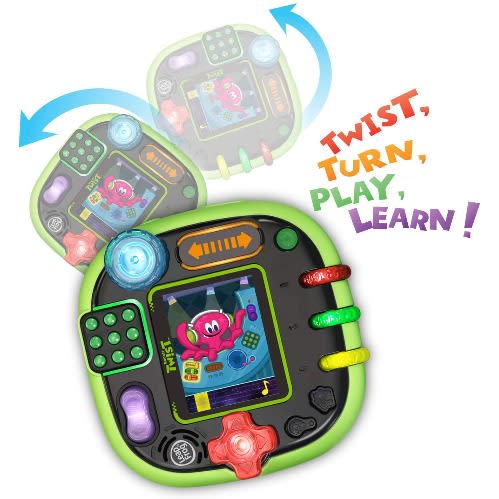 Twist, turn, play and learn with the RockIt Twist rotatable, single-player game system with three profiles! Four sides of colorful, light-up controls include buttons, dials, a spinner, slider, switch and D-pad to provide a totally unique way to play exciting video games. During game play, one of the eight game controls will light up to indicate when each control is needed throughout a game. Nurture three adorable virtual RockIt Pets that hatch and grow from eggs. 12 preloaded games across five game play categories have three levels of difficulty that help kids learn skills including literacy, math, problem-solving and creativity all while having fun! Since there’s no need for Wi-Fi, kids can play anywhere. Listen to your own music with the built-in MP3 player. Volume controls and headphone jack are also included. Game packs (sold separately) include more games, plus a new RockIt Pets virtual pet and a RockIt Pets figure to match. For ages 4-8 years. Rechargeable batteries included.