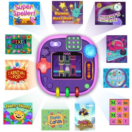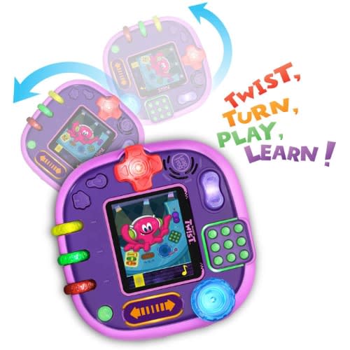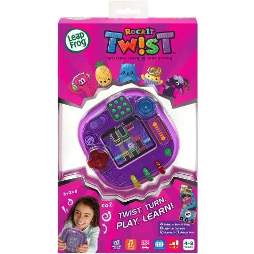 Twist, turn, play and learn with the RockIt Twist rotatable, single-player game system with three profiles! Four sides of colorful, light-up controls include buttons, dials, a spinner, slider, switch and D-pad to provide a totally unique way to play exciting video games. During game play, one of the eight game controls will light up to indicate when each control is needed throughout a game. Nurture three adorable virtual RockIt Pets that hatch and grow from eggs. 12 preloaded games across five game play categories have three levels of difficulty that help kids learn skills including literacy, math, problem-solving and creativity all while having fun! Since there’s no need for Wi-Fi, kids can play anywhere. Listen to your own music with the built-in MP3 player. Volume controls and headphone jack are also included. Game packs (sold separately) include more games, plus a new RockIt Pets virtual pet and a RockIt Pets figure to match.