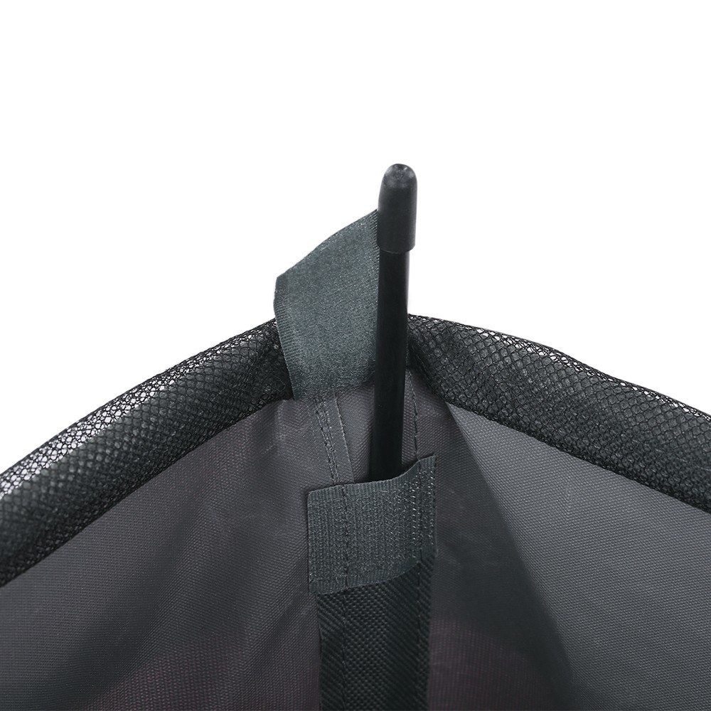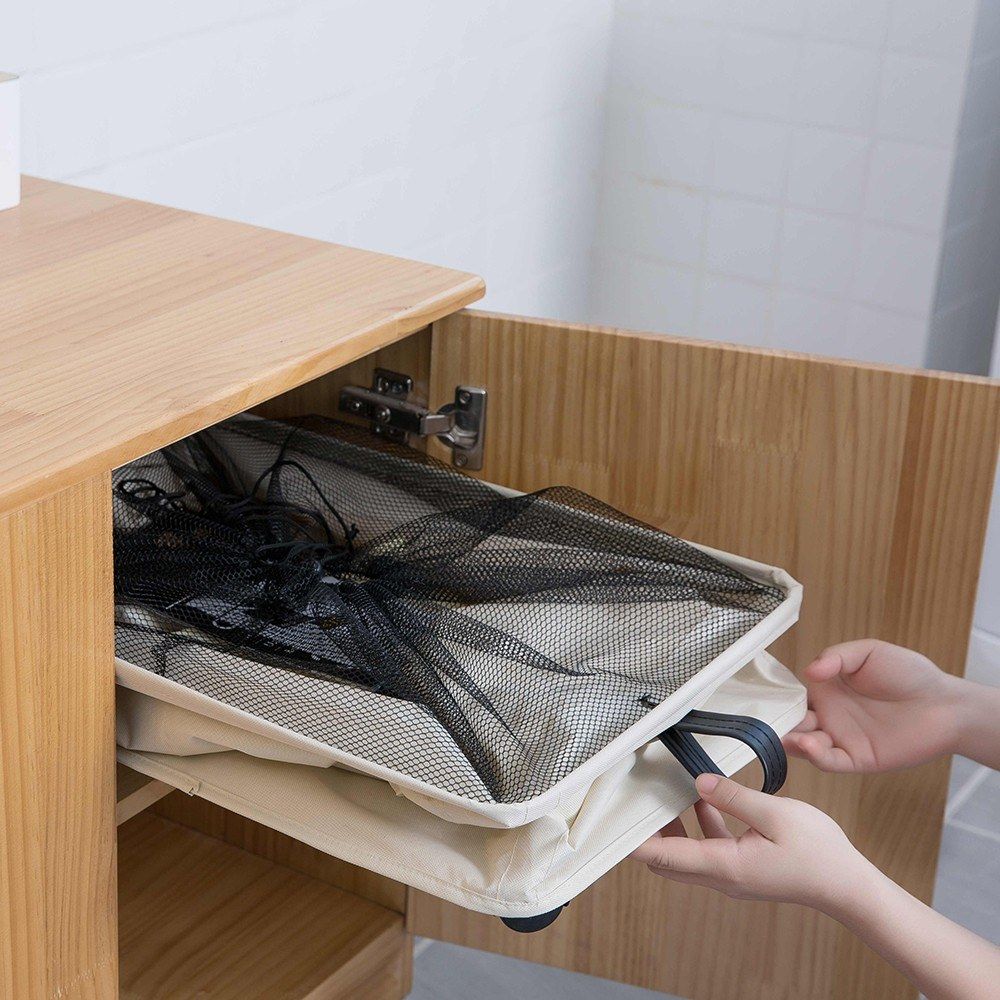 Mesh drawstring in the top keeps laundry in place. Both basket and rods are foldable (take out the rods first), space-saving when not in use.