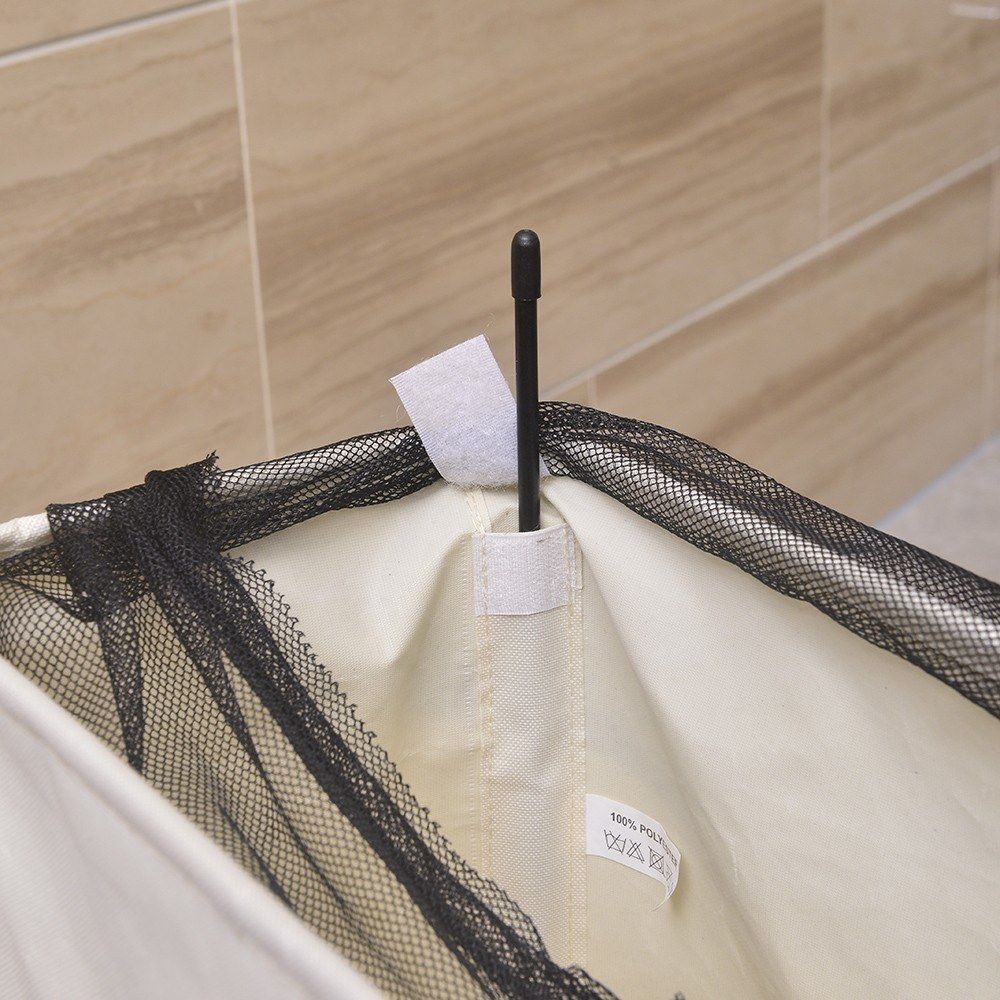 Mesh drawstring in the top keeps laundry in place. Both basket and rods are foldable (take out the rods first), space-saving when not in use.