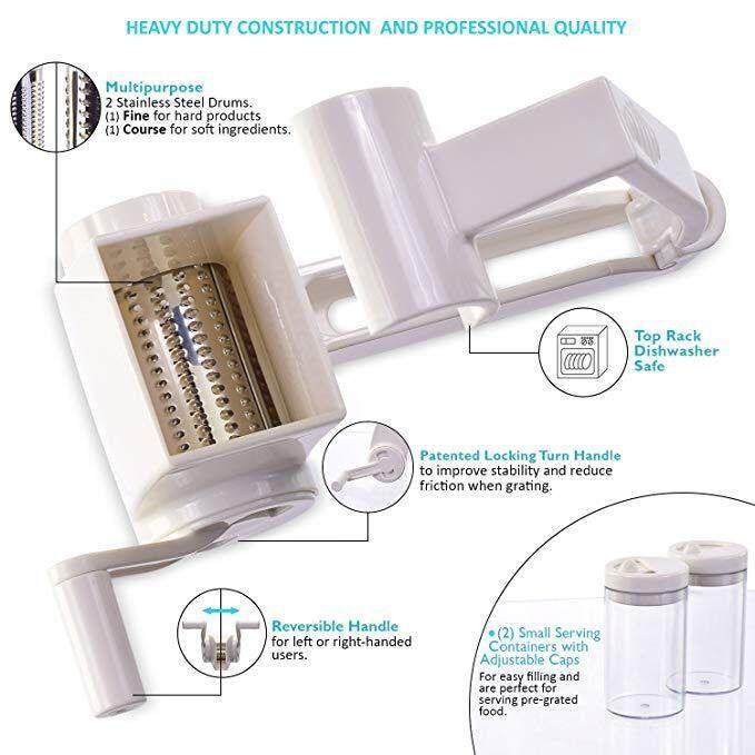 -Rotary cheese grater works quickly to grate more cheese in less time.