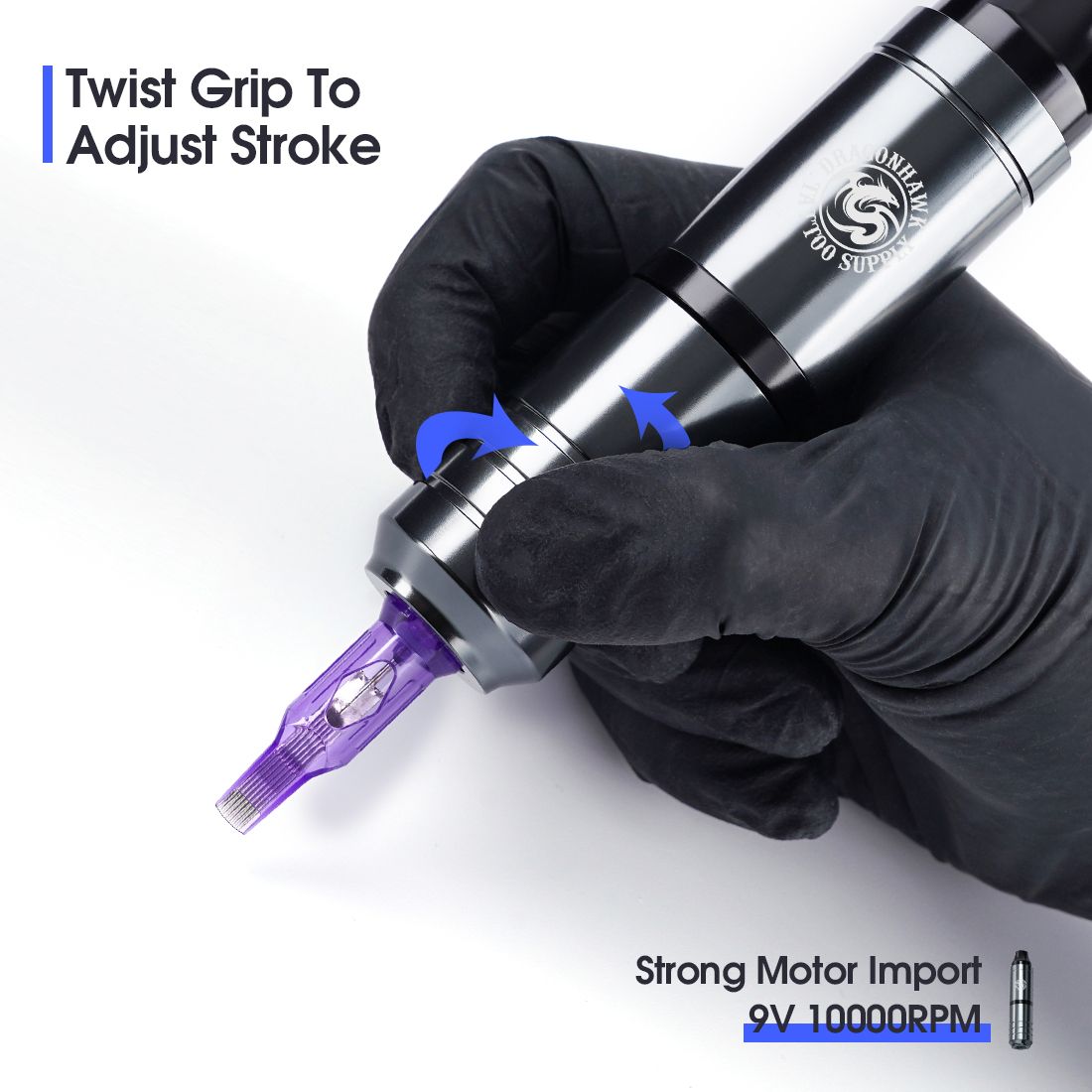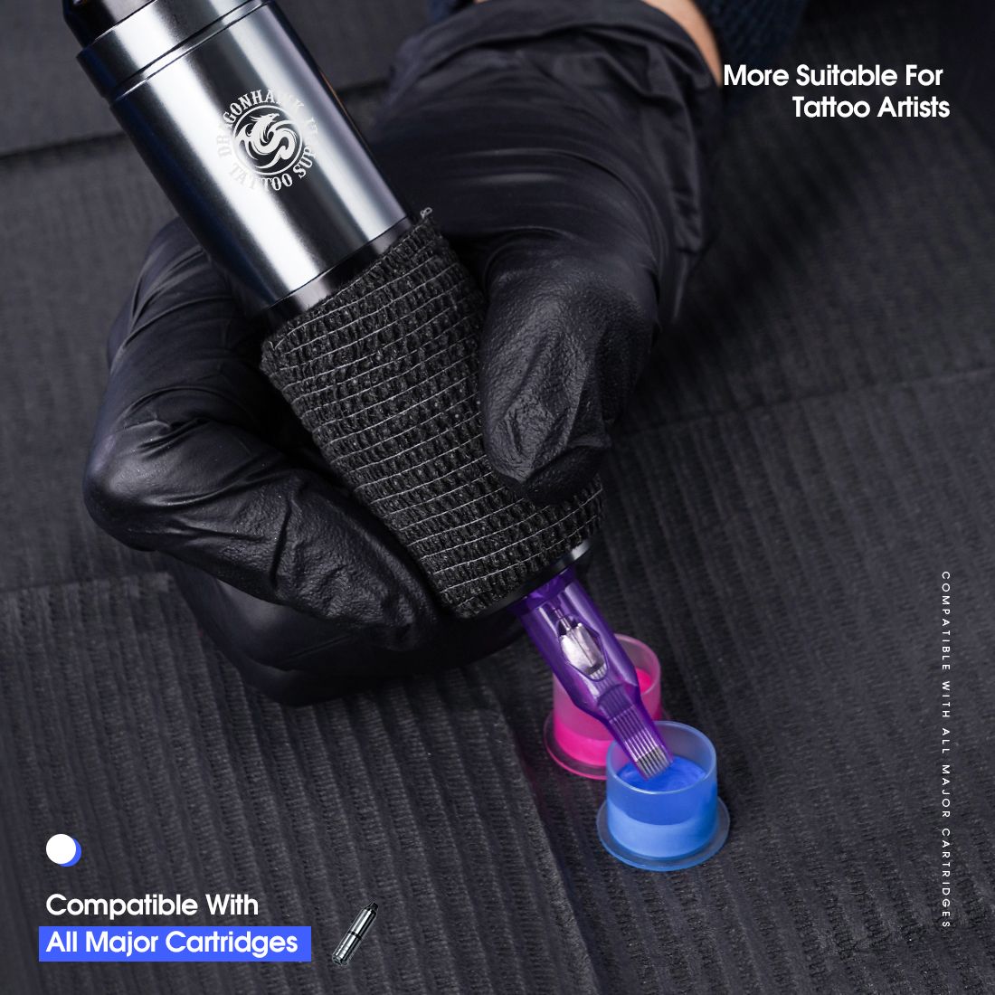 Premium quality start from the high quality aluminum,precise CNC processing.Ergonomic grip design for comfortable and flexible working condition.Matches with all brands of standard needle cartridges.High quality for professional lining,shading,coloring,packing.blending tattooing and permanent makeup.