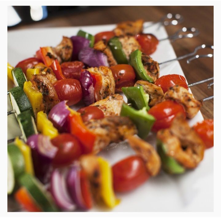 Includes seven kebab skewers, rotisserie shaft with end forks and a drip pan