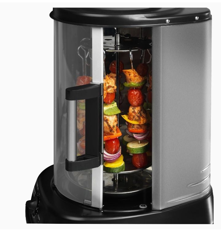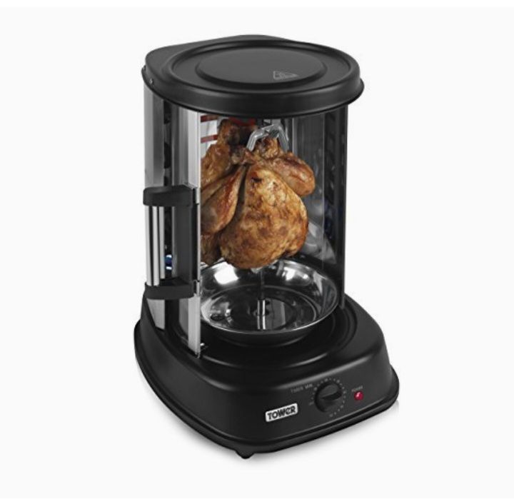 The Tower Rotating Vertical Rotisserie Grill features a rotating rotisserie shaft which slowly rotates your food as it cooks to evenly cook food from every angle. The rotating shaft not only cooks your foods to perfection every time, but the technology also eliminates the need for oil, giving you a faster, healthier and more economical way of cooking. The highly efficient appliance can cook a whole chicken in as little as 28 minutes, significantly cutting cooking times, but not compromising on taste. Cooking via the rotisserie method also eliminates the risk of dry meat as the constant rotation of the food inside keeps meat juices in for optimum succulence. This appliance is the right choice for those pursuing a healthy lifestyle. Requiring no oil, the grill filters off excess fat and unwanted grease, channelling it into a separate drip tray, for a healthier way to enjoy your favourite foods. Easy to use With a removable rotisserie shaft with end forks as well as a generously proportioned sliding glass door, putting your food into the grill couldn't be easier. Large capacity The large glass door not only lets you see your food as it cooks, but is also large enough to make placing larger items like whole chickens or large joints of meat into the grill extremely simple. Fast cooking An easy to use dial is on hand to let you set the timer up to 60 minutes, while an automatic safety protection function will automatically shut off when the door is open for optimum safety while cooking.